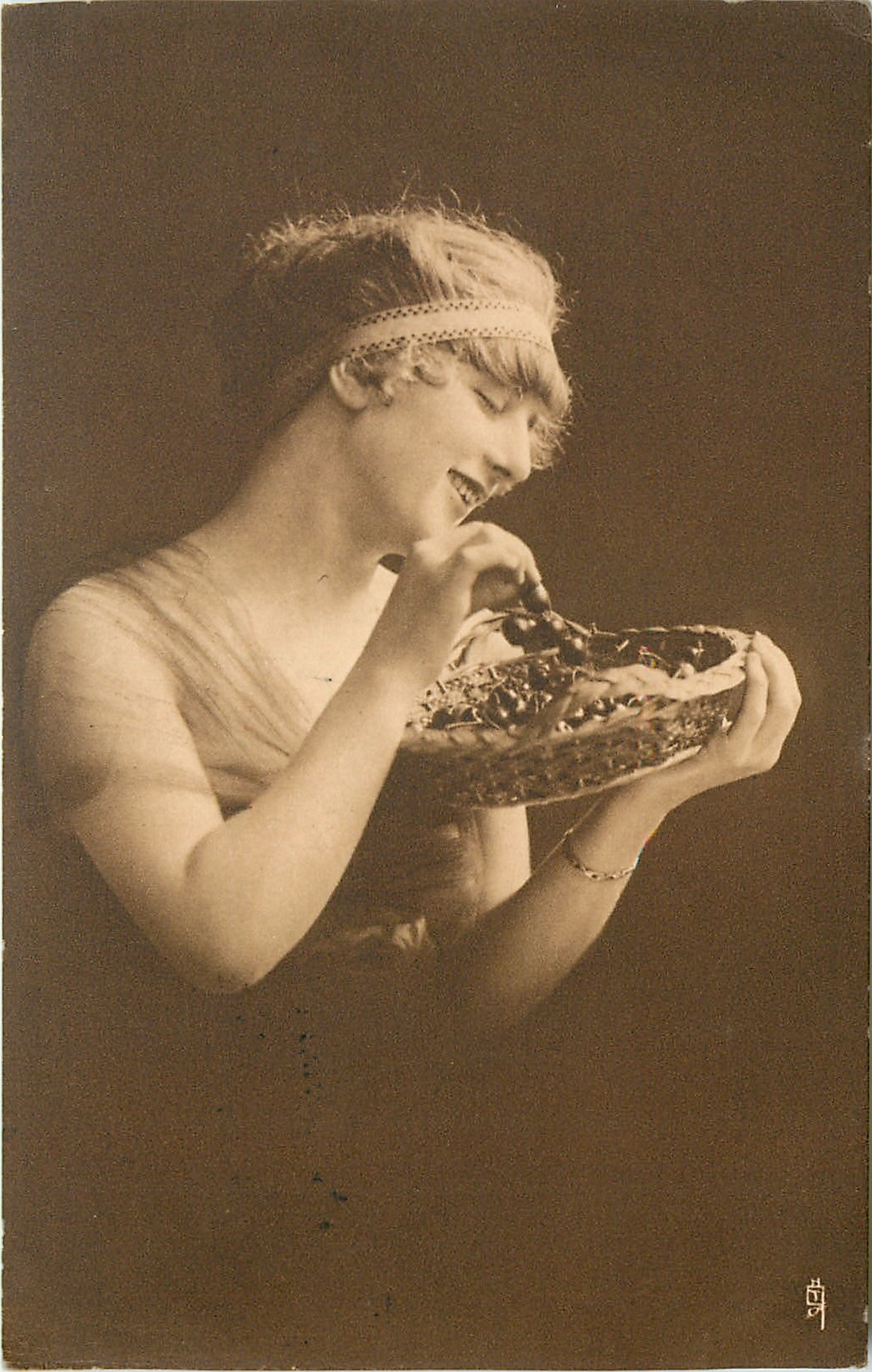 girl in off shoulder dress, band around hair, eats cherries from basket