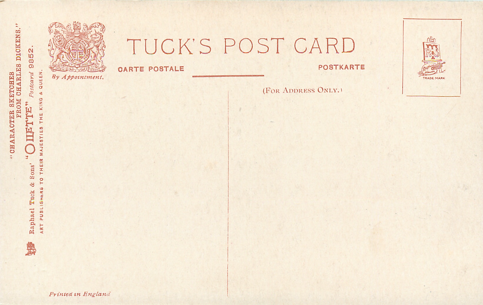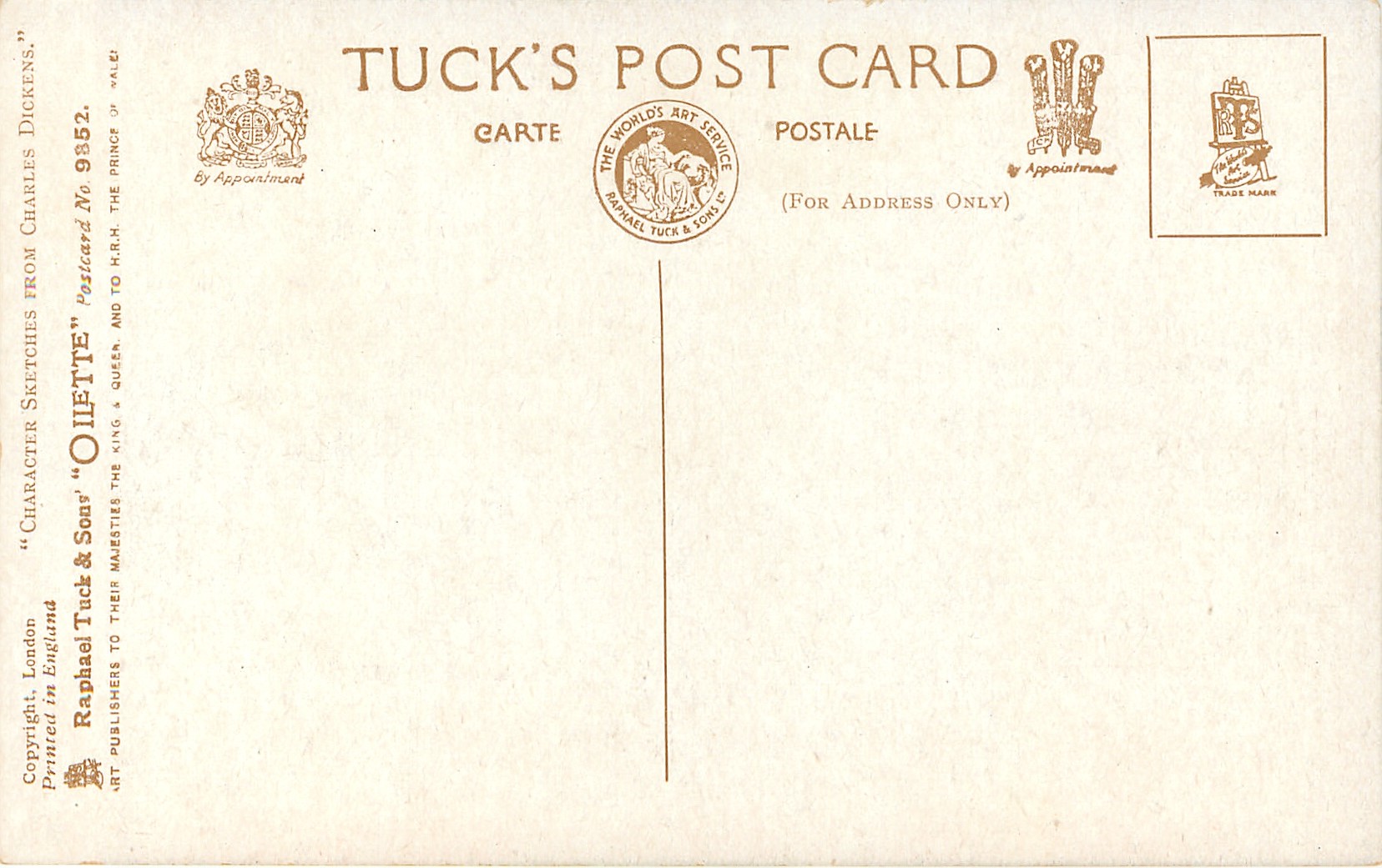 OILETTE. with or w/o PRINTED IN ENGLAND or PRINTED IN THE UNITED KINGDOM with or w/o COPYRIGHT LONDON, come with blue IN DICKENS LAND lower left, listed in 1911/1912 & 1913/1914 &1930 POSTCARD Catalogues & in 1932 ART SERVICE Catalogue, listed in TUCK'S TRAVELOGUES (USA?1905)