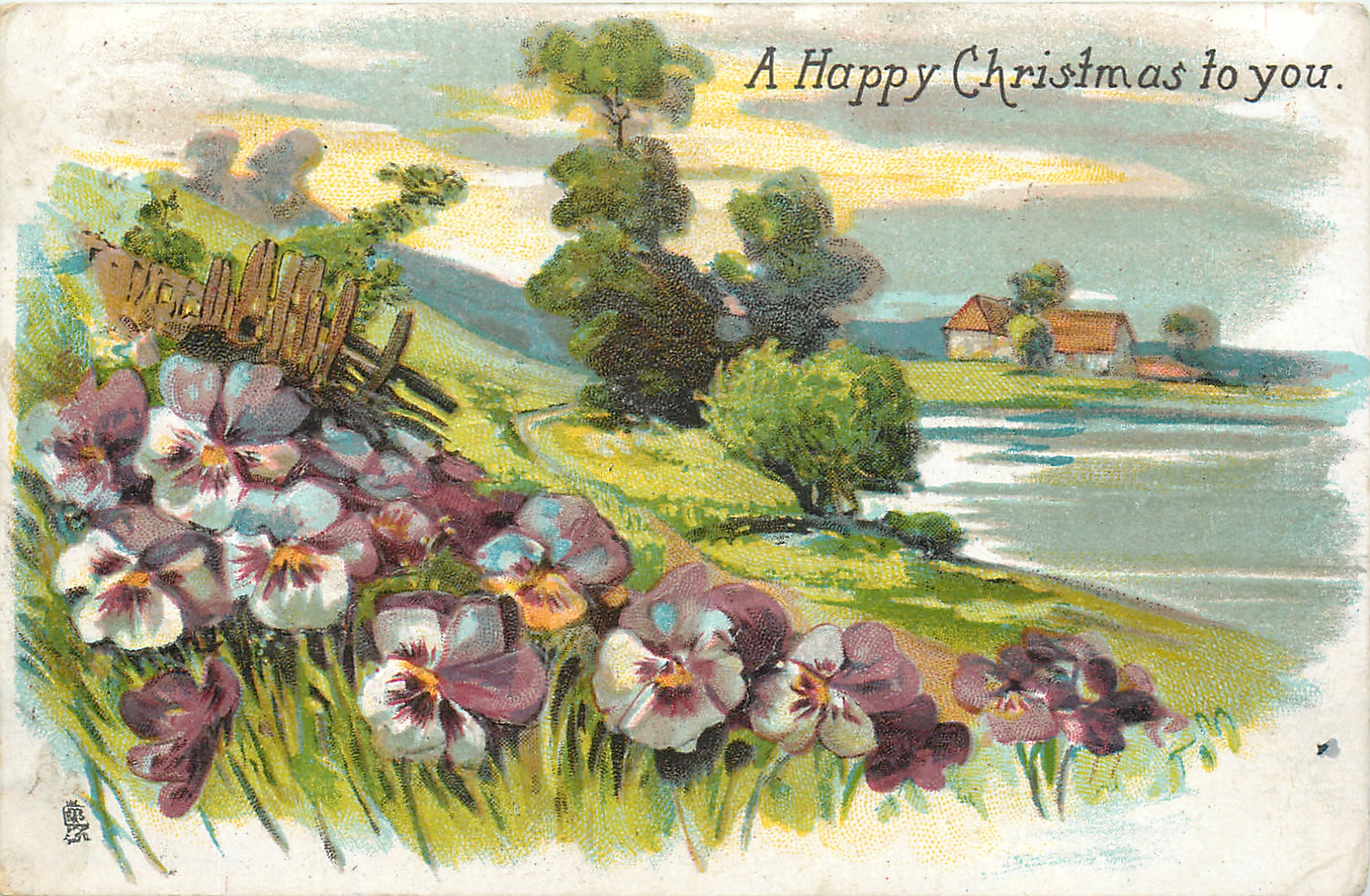 lake surrounded by trees and flowers which are purple, blue and pink, house behind