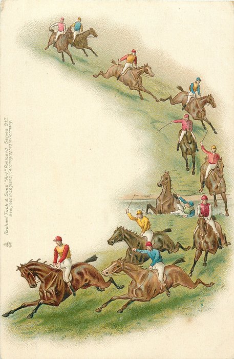 jockeys steeplechasing, one fallen in water, brown horse leads