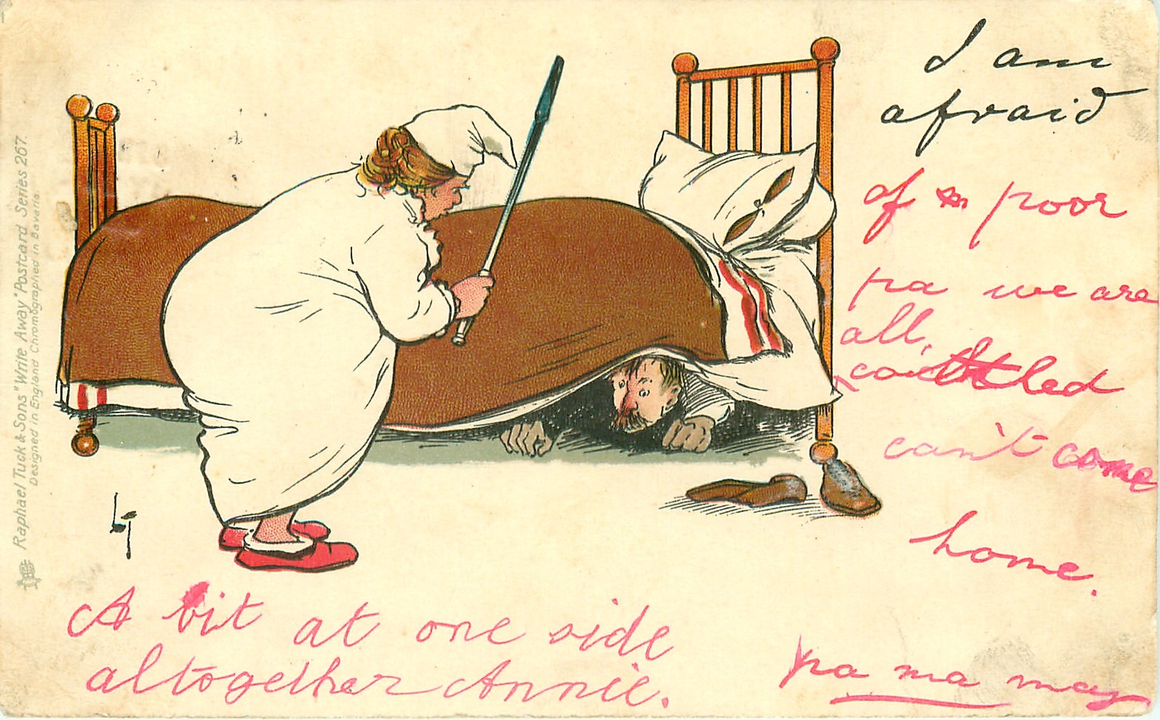I AM AFRAID husband under the bed threatened by wife waving a poker