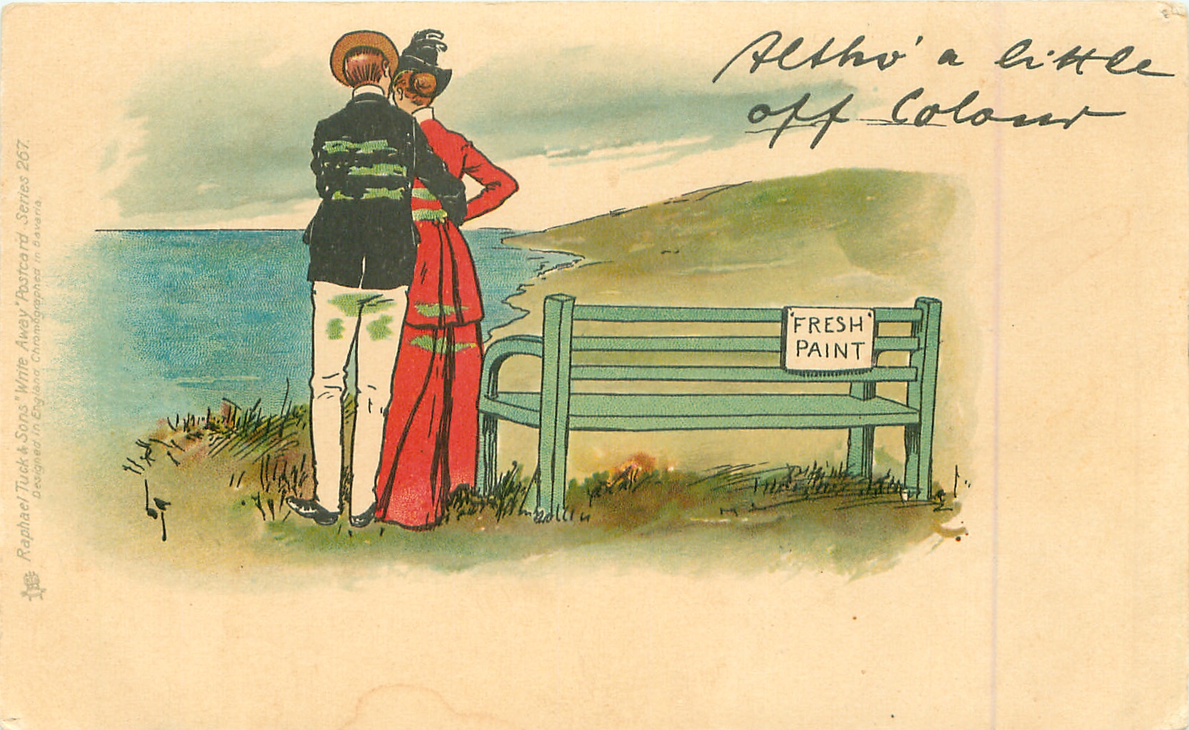 ALTHO' A LITTLE OFF COLOUR couple whose clothes have picked up paint from a seat