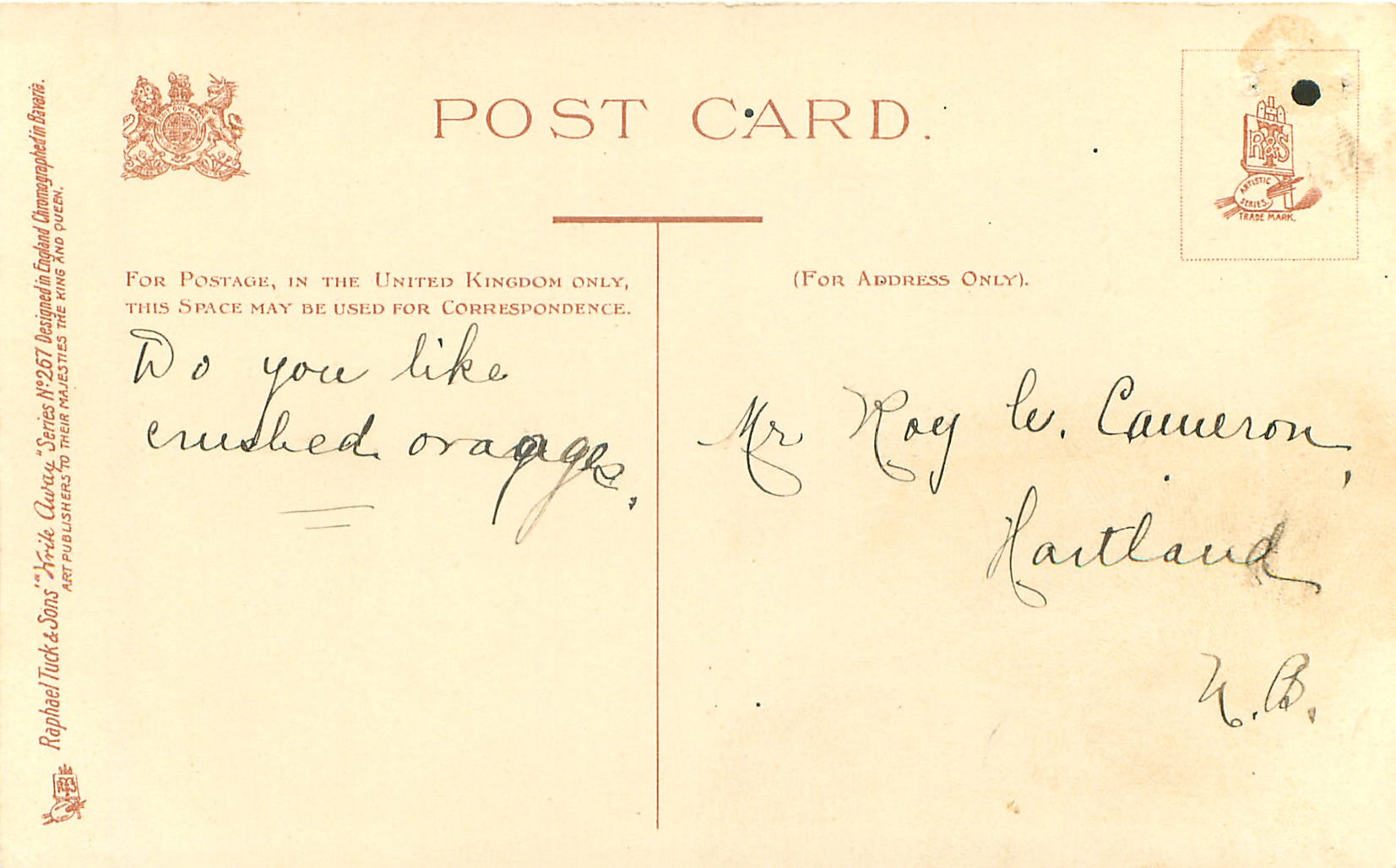 WRITE AWAY, u/b or d/b, DESIGNED IN ENGLAND, CHROMOGRAPHED IN BAVARIA, listed in 1904 POSTCARD Catalogue