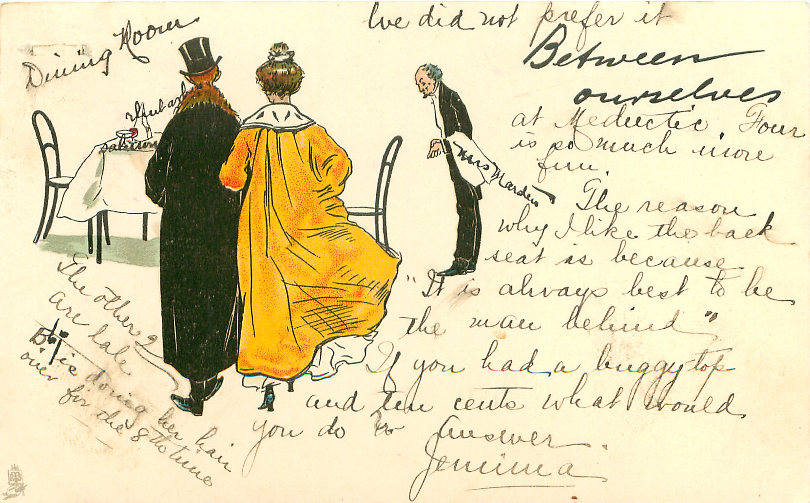 BETWEEN OURSELVES man & women walk to secluded table for two