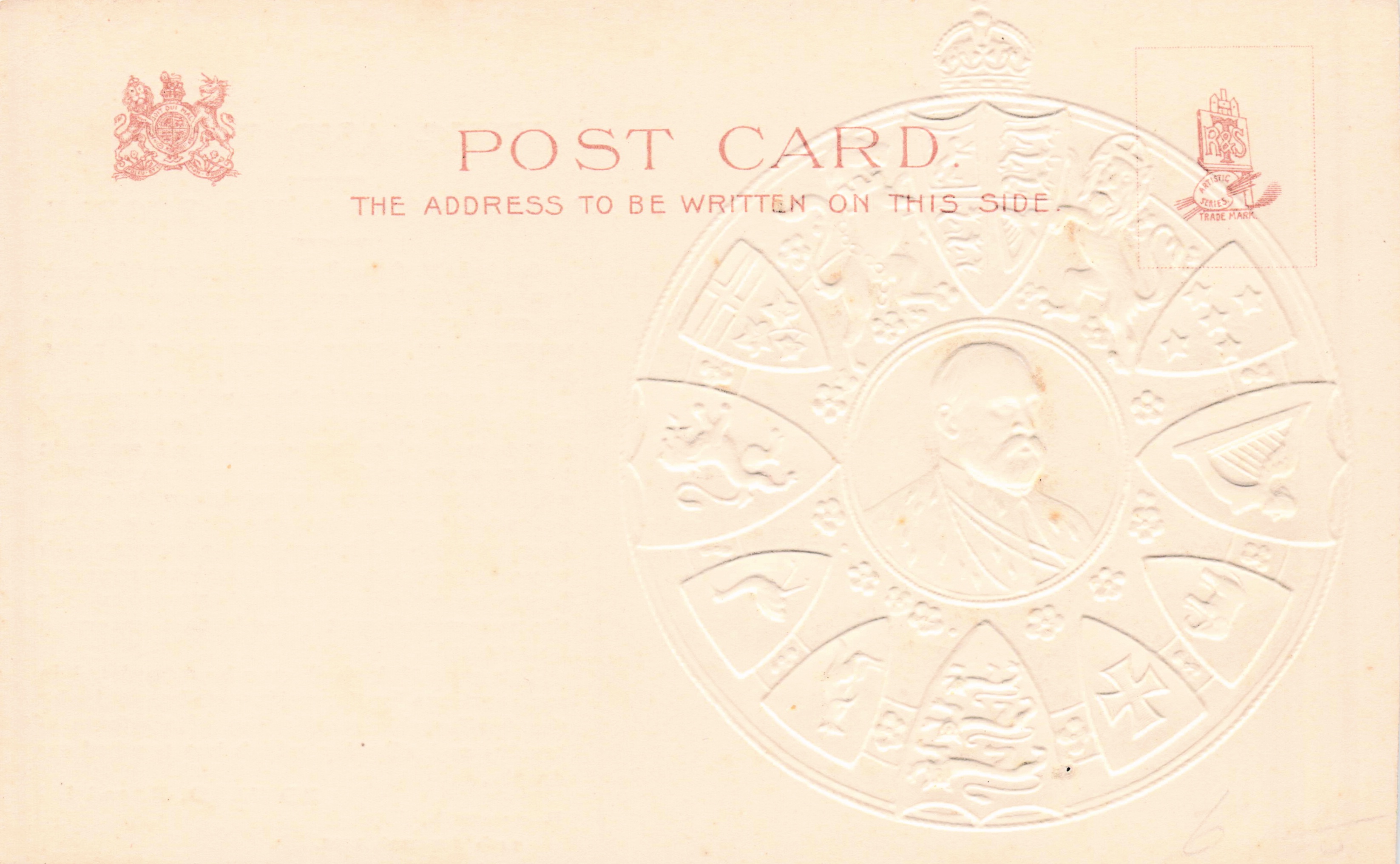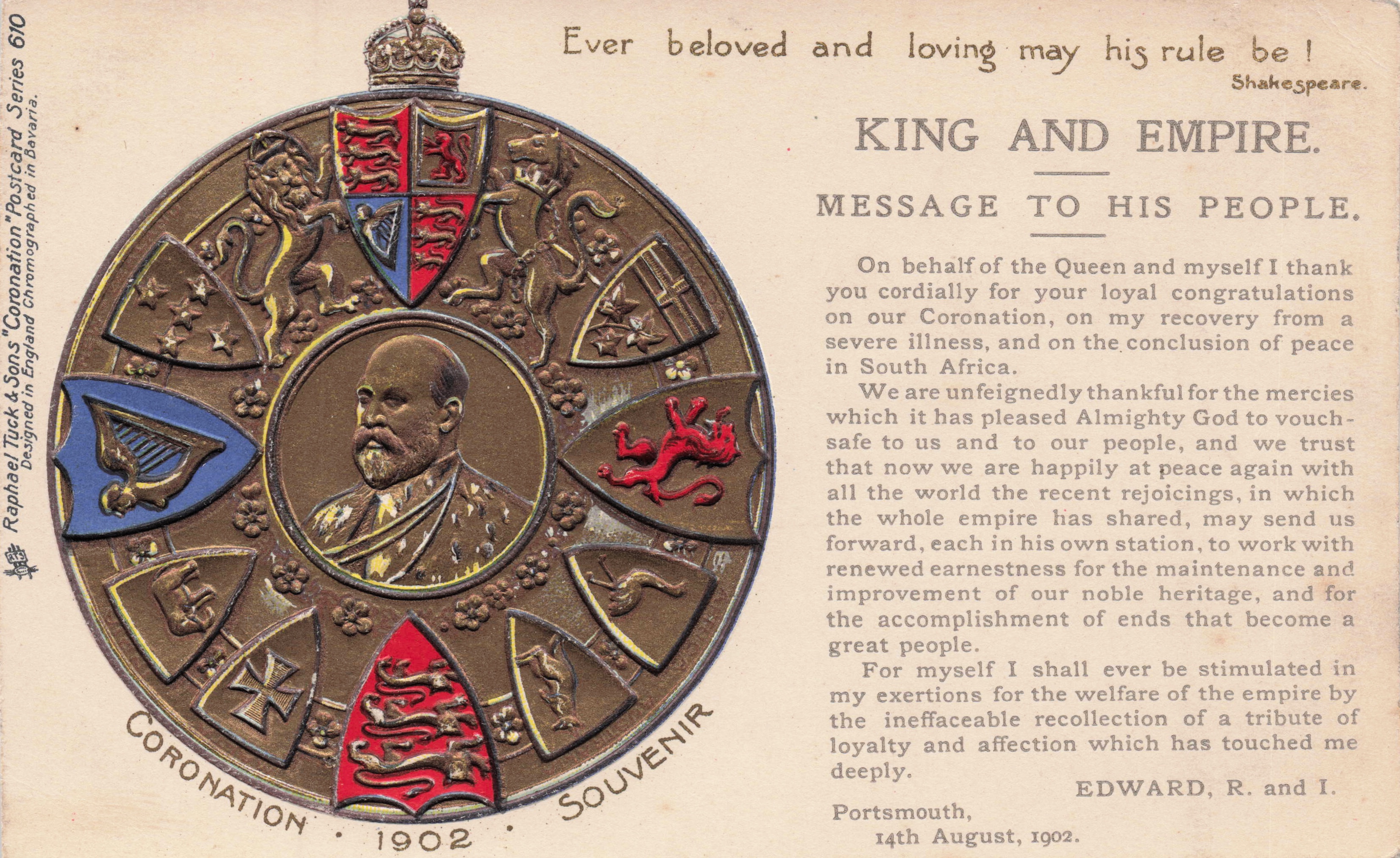 u/b, embossed, gold heraldic medallion inset of King, surrounded by Arms of Colonies AUS,CAN,GBR,IND,NZL,SAF), DESIGNED IN ENGLAND, CHROMOGRAPHED IN BAVARIA comes with or without KING AND EMPIRE and very long MESSAGE TO HIS PEOPLE from PORTSMOUTH 14TH AUGUST, 1902