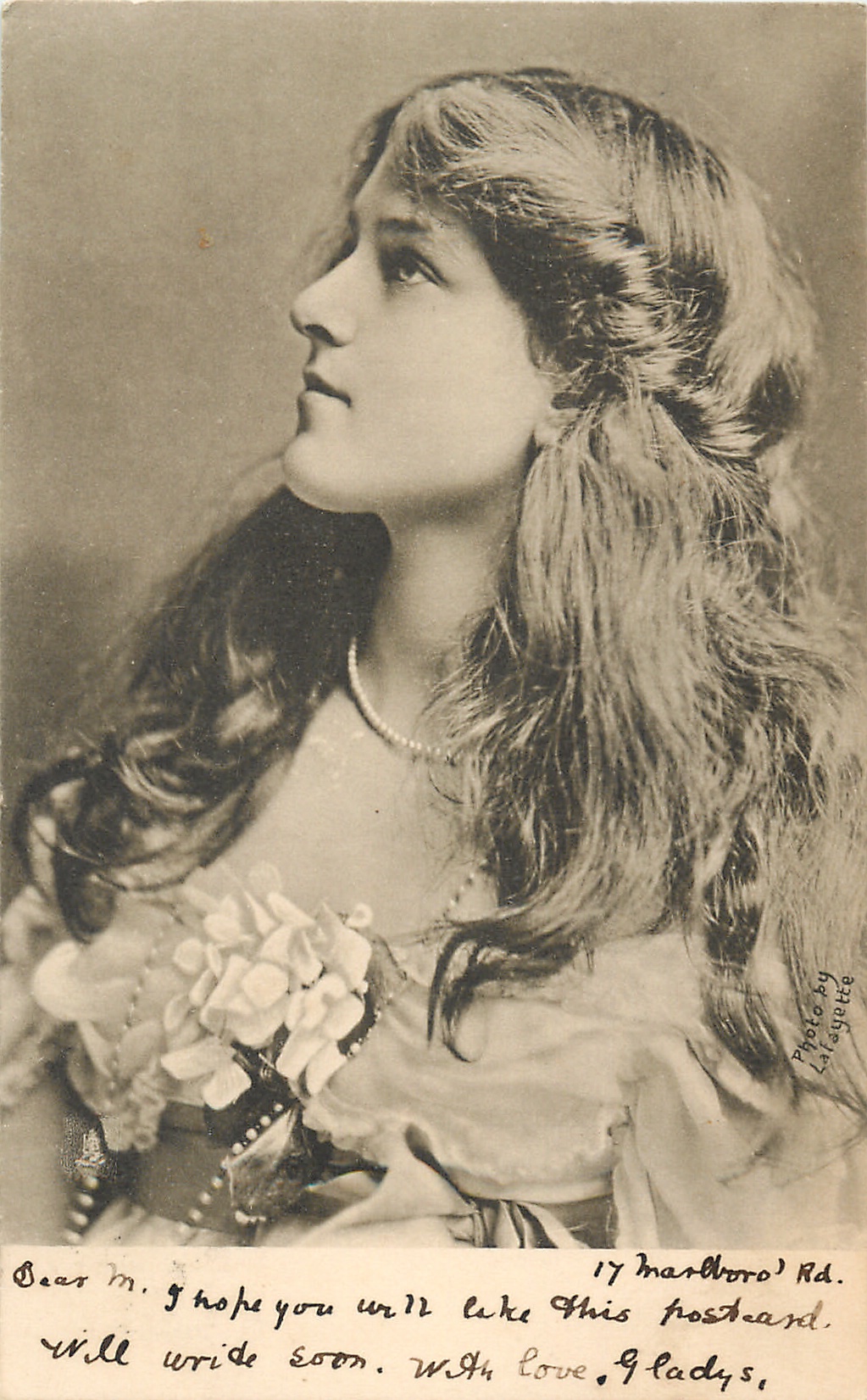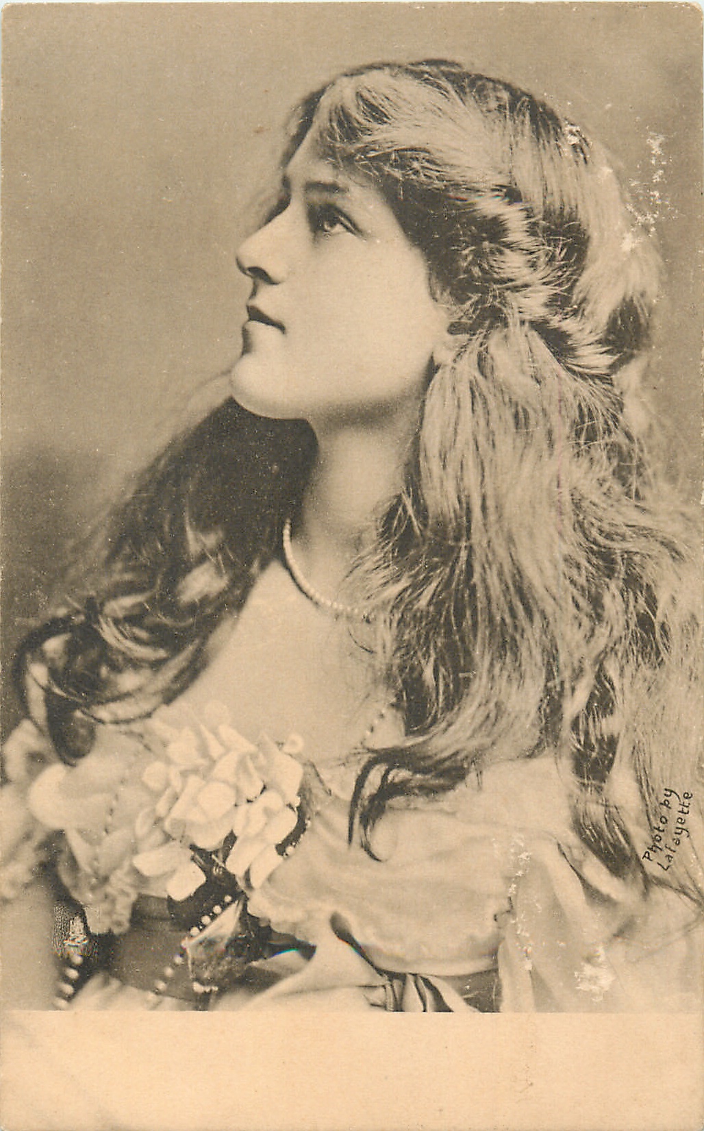 girl with long hair down to both shoulders, floral corsage, beaded, pearl necklace, faces & looks left