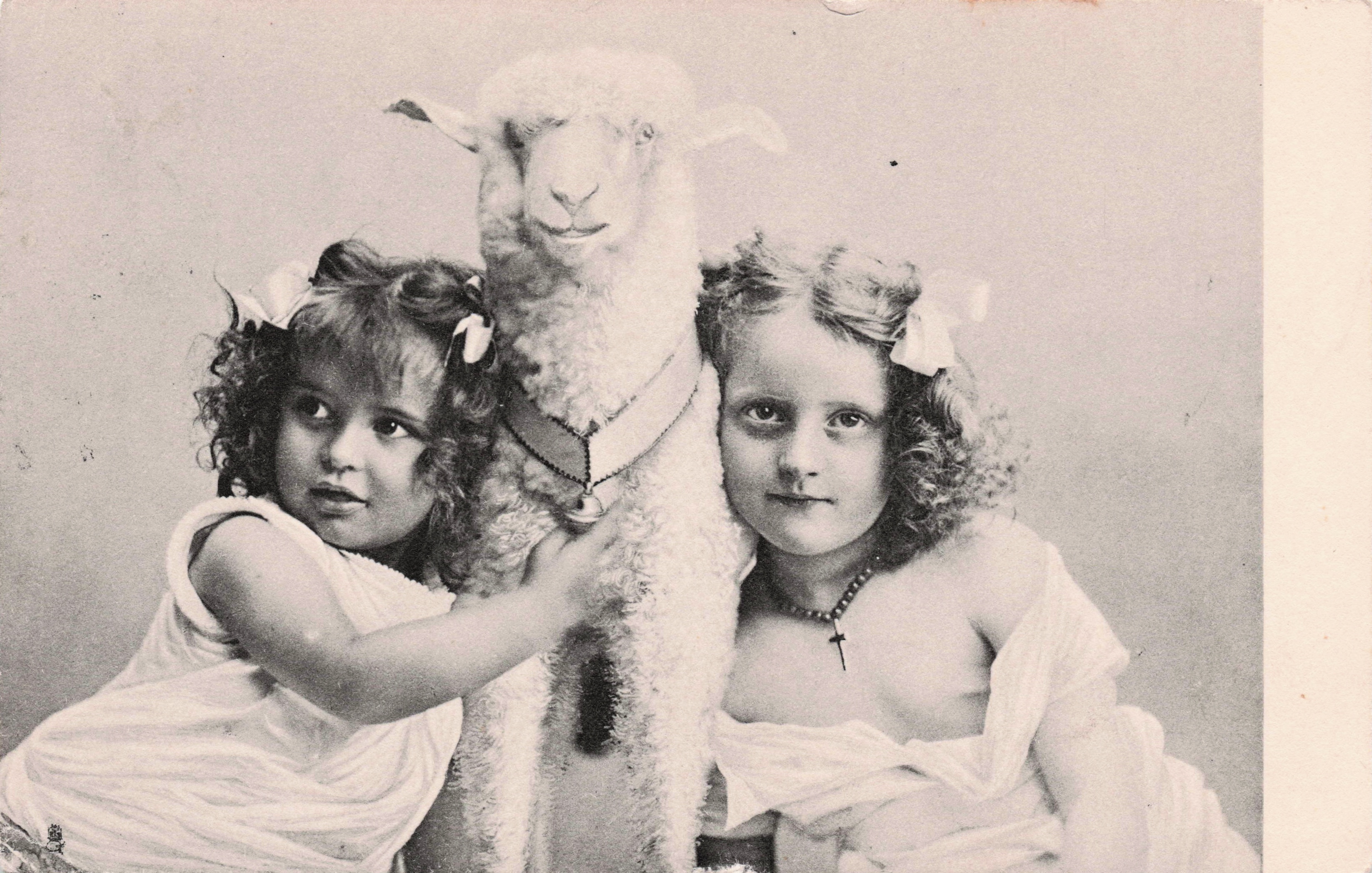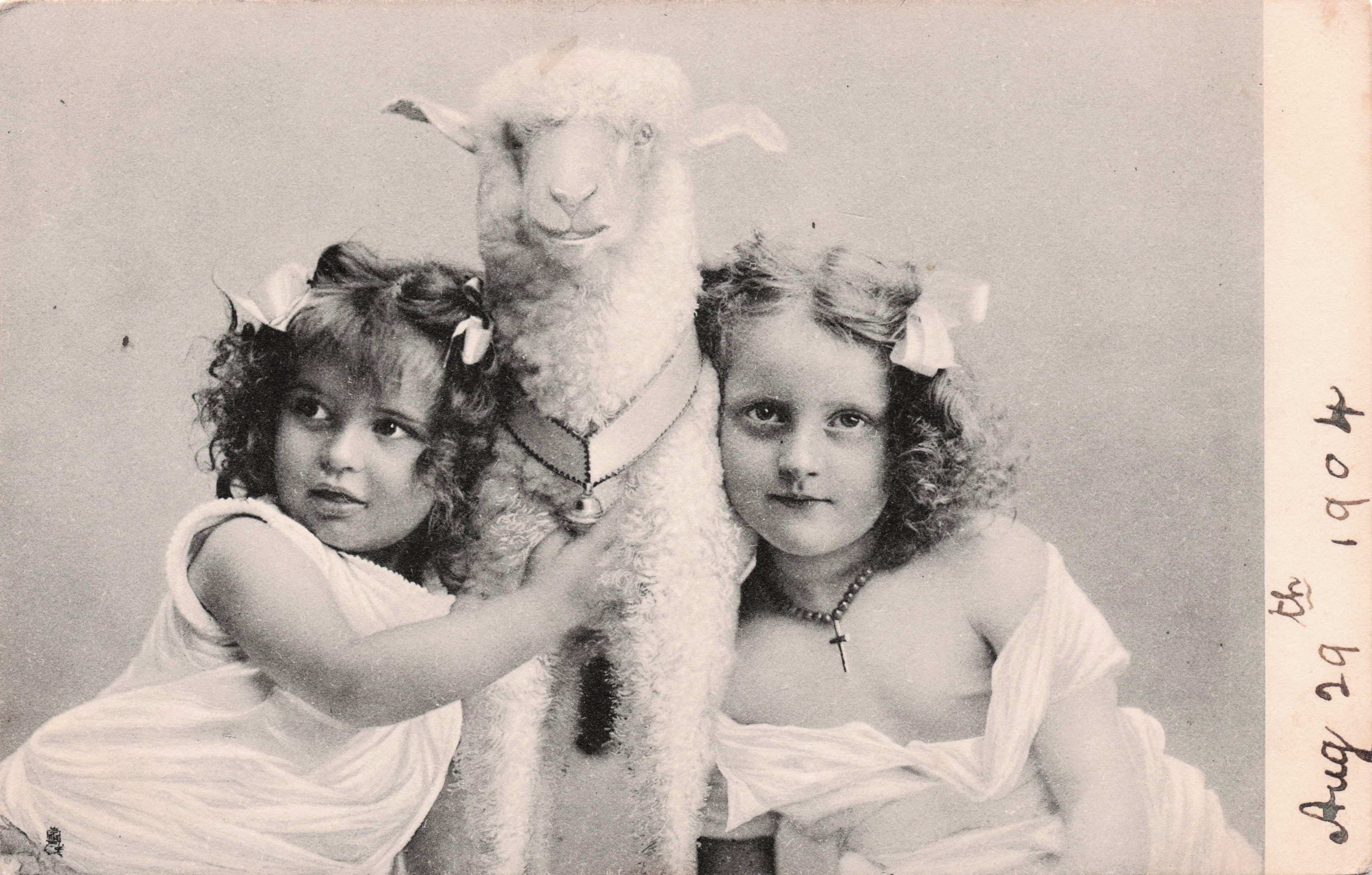 lamb with bell between two girls, left girl touches bell with hand
