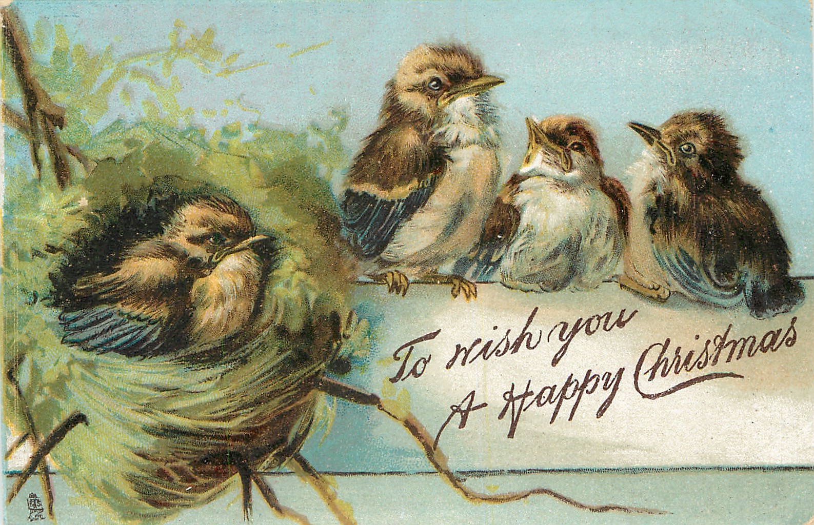 TO WISH YOU A HAPPY CHRISTMAS four fledgling birds, one on the nest