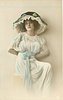 young girl with fancy hat, wearing blue, seated, both hands behind back, looks up at camera