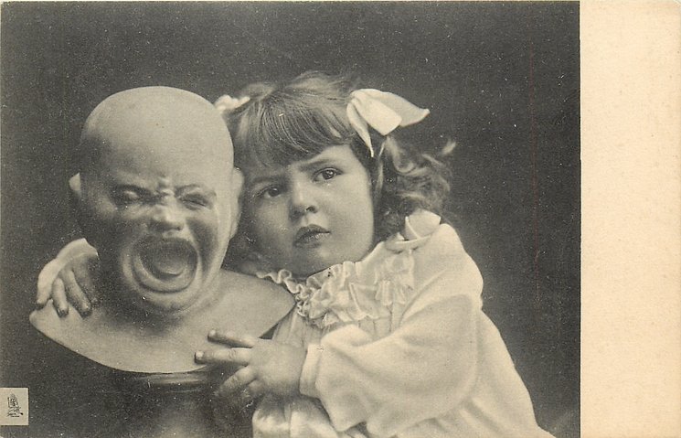 girl cuddles crying gargoyle with bald head & open mouth, she faces front, looks up