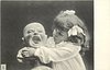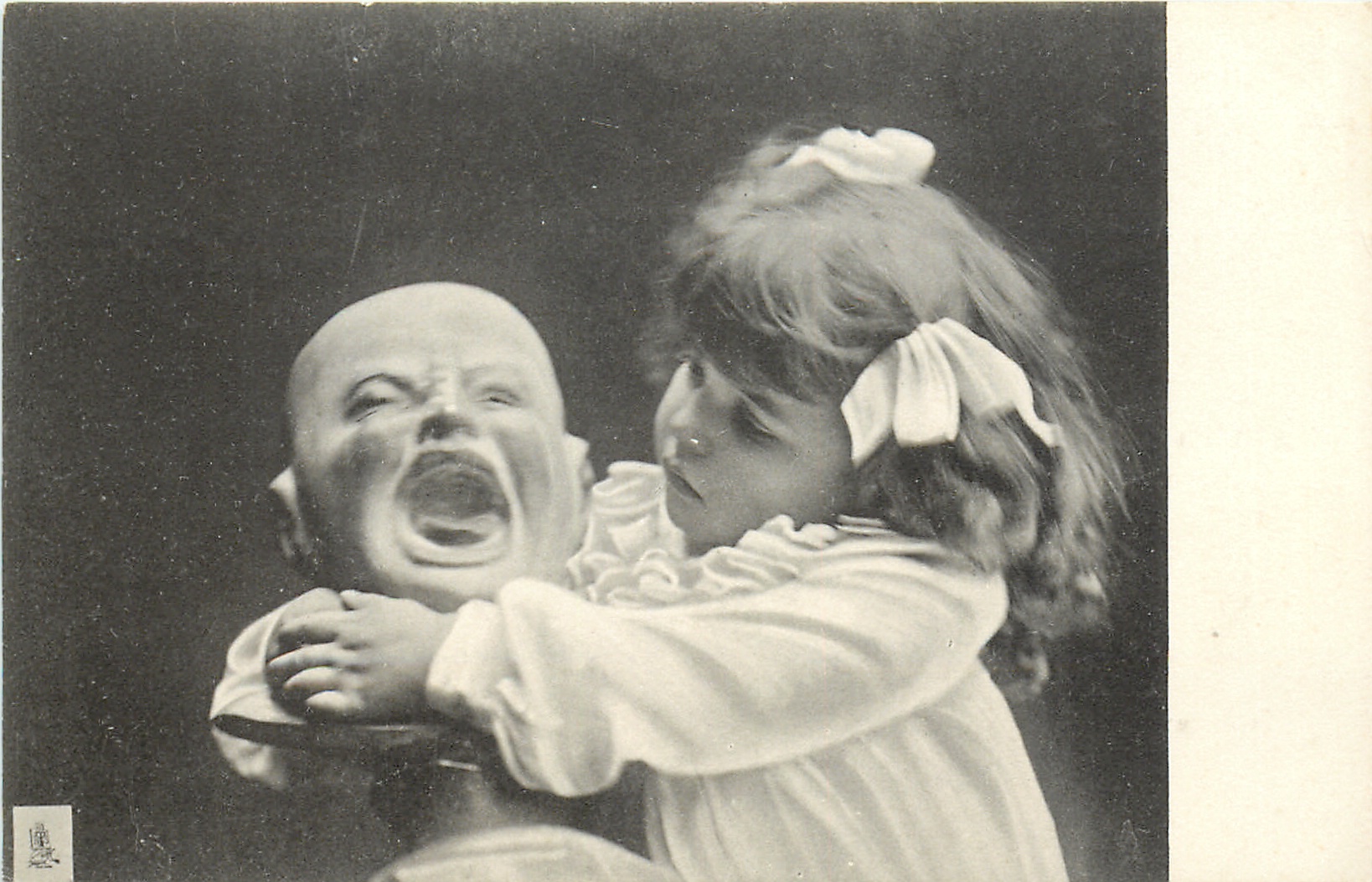 girl holds & looks at crying gargoyle with bald head & open mouth