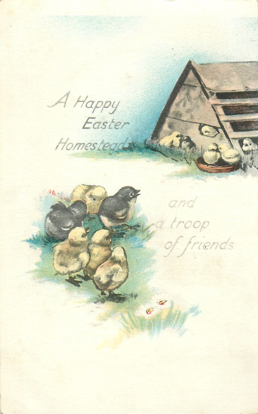 A HAPPY EASTER HOMESTEAD, AND A TROOP OF FRIENDS chicken coop, many chicks