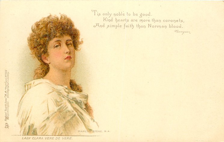verse:- 'TIS ONLY NOBLE TO BE GOOD. KIND HEARTS ARE MORE THAN CORONETS, AND SIMPLE FAITH THAN NORMAN BLOOD., same image V see next card