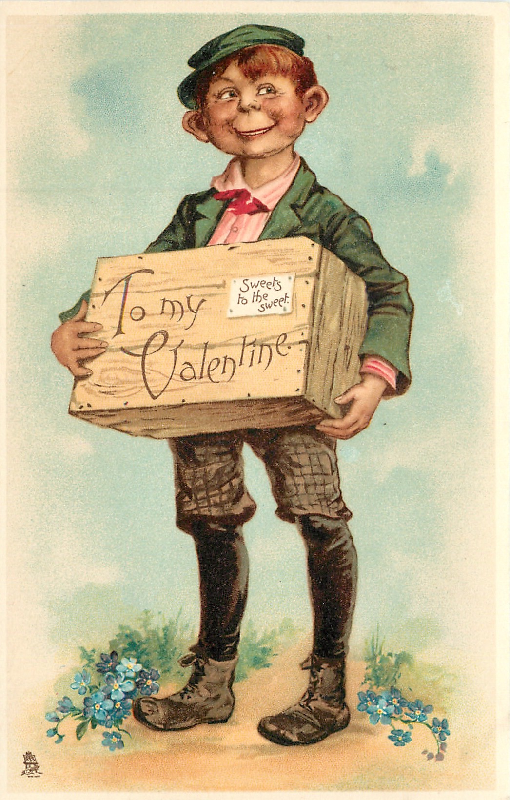 TO MY VALENTINE boy carrying wooden box SWEETS TO THE SWEET