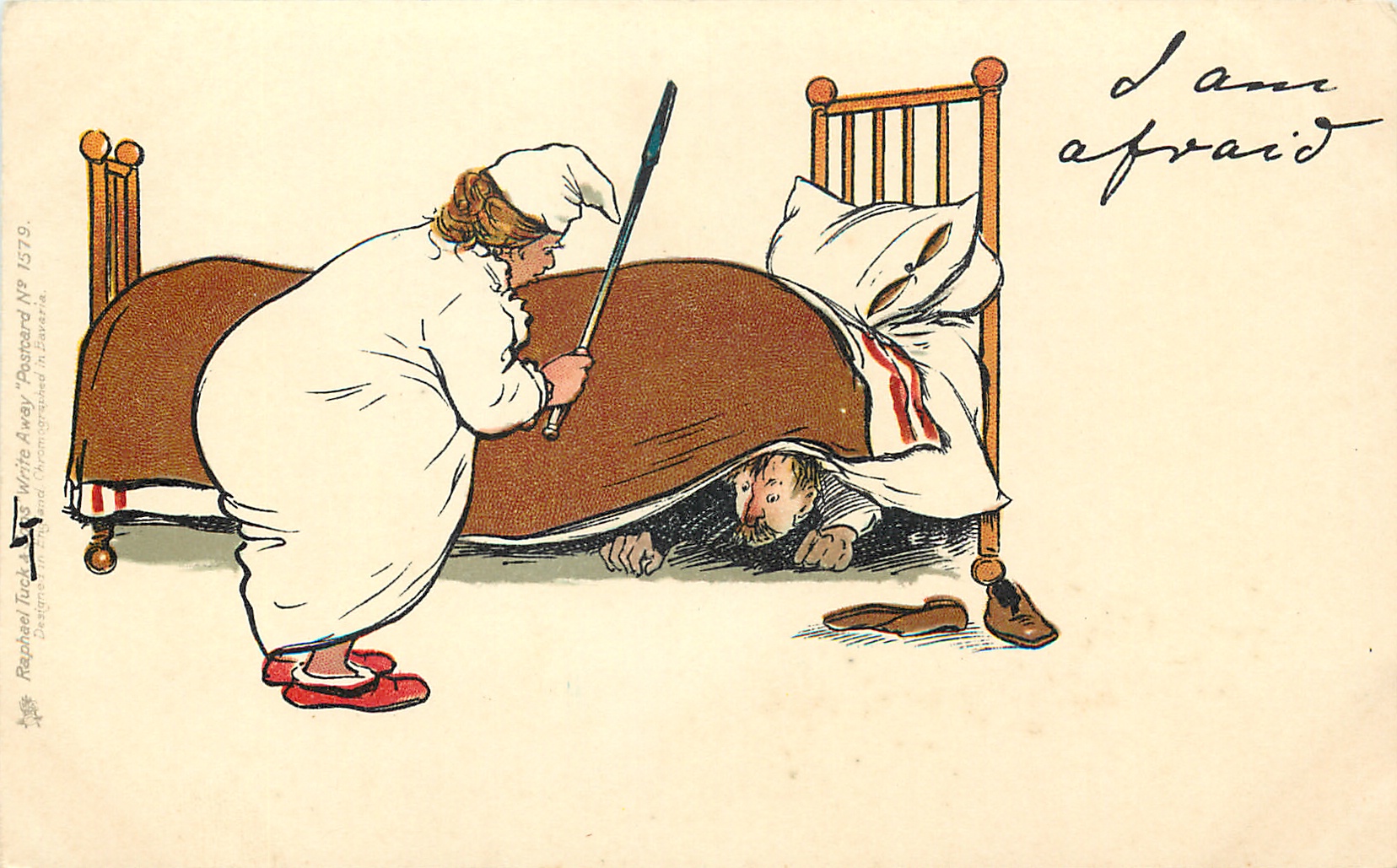 I AM AFRAID husband under the bed threatened by wife waving a poker