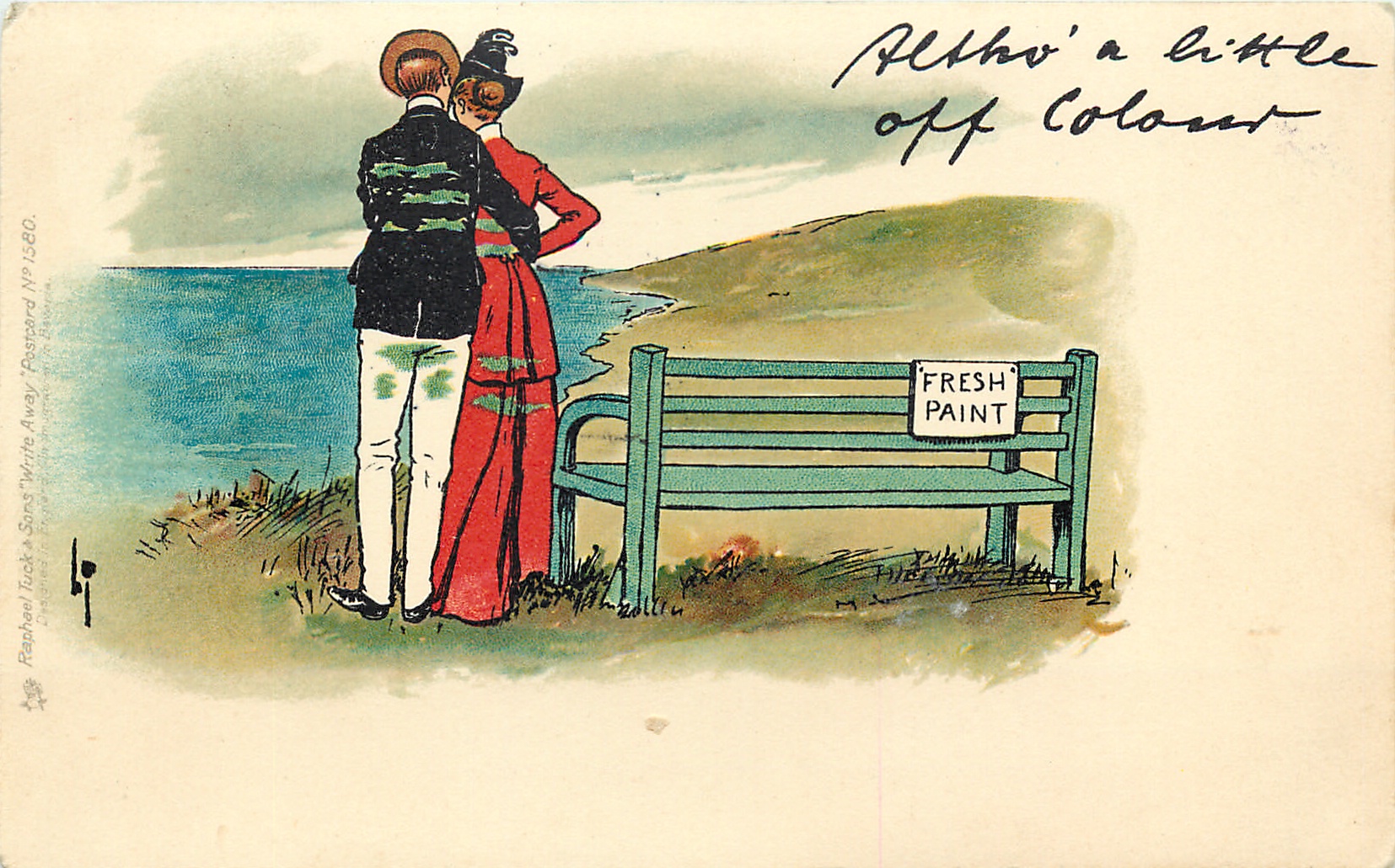 ALTHO' A LITTLE OFF COLOUR couple whose clothes have picked up paint from a seat