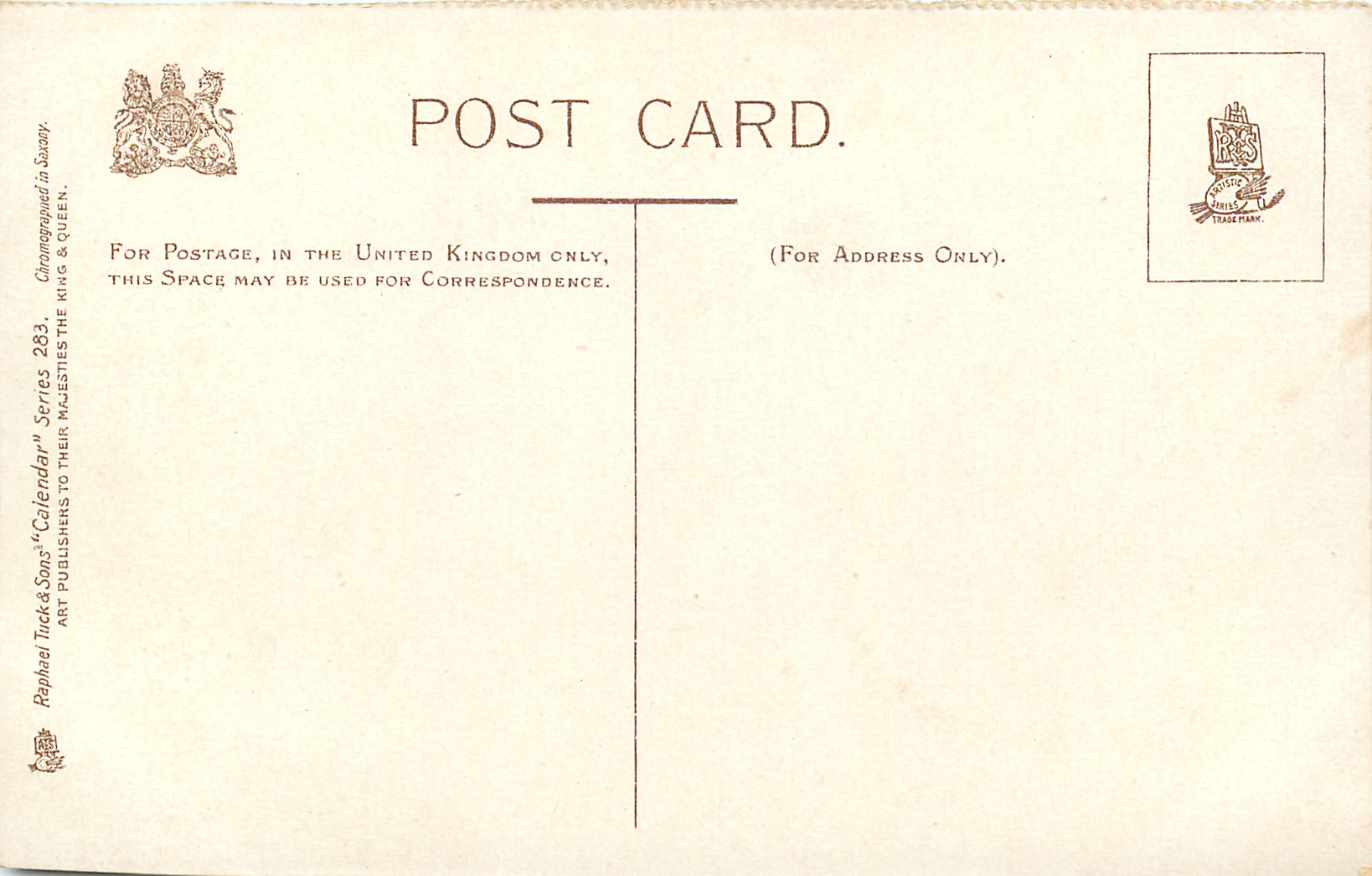 CHROMOGRAPHED IN SAXONY, and on front RAPHAEL TUCK & SONS CO. LTD, LONDON, PARIS, NEW YORK, DESIGNED IN ENGLAND, PRINTED IN SAXONY