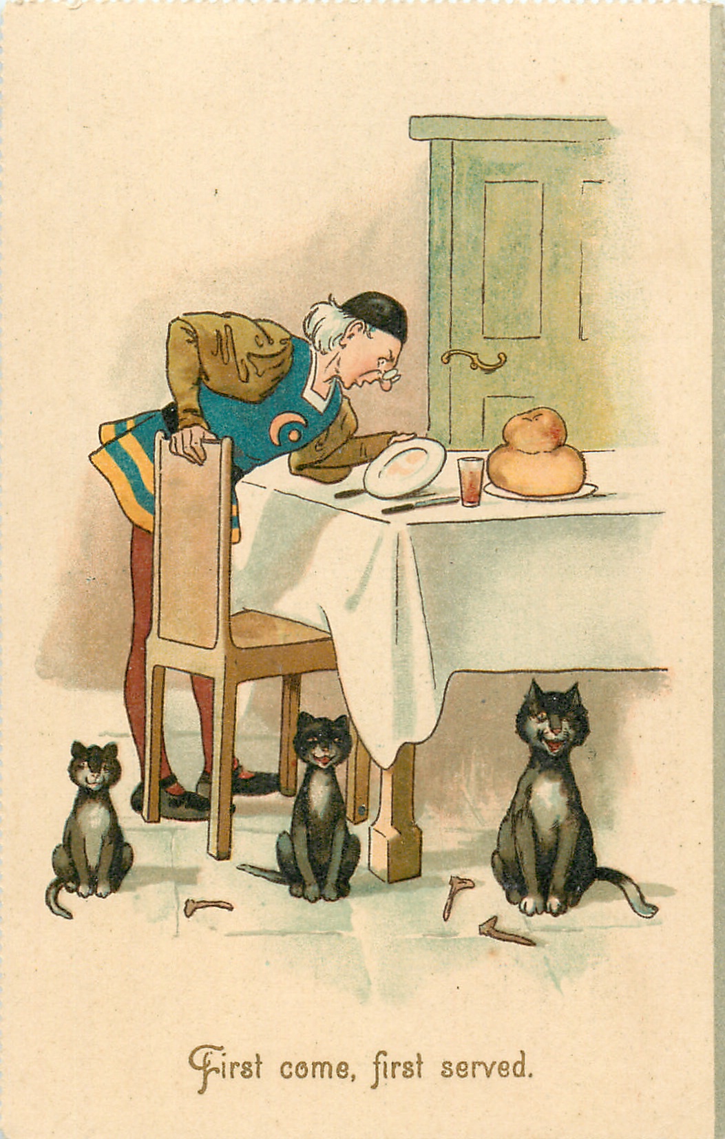 FIRST COME, FIRST SERVED three contented black cats & a distressed man whose food they have eaten