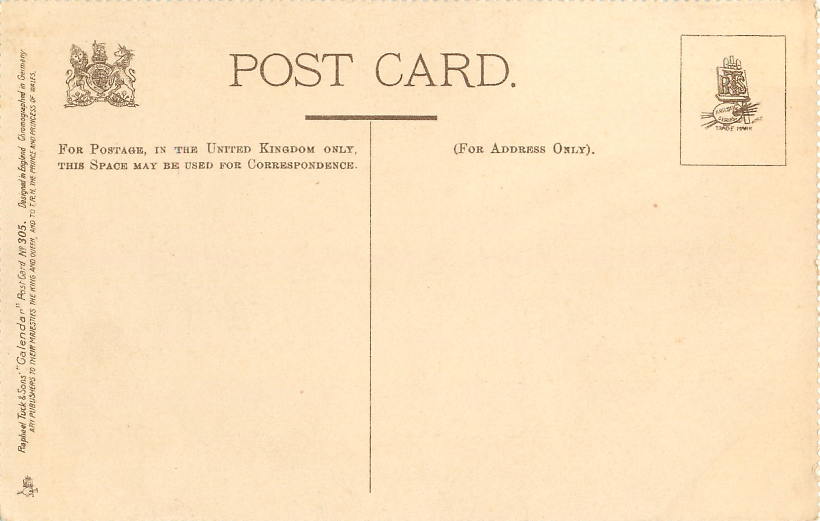perforated cards, DESIGNED IN ENGLAND, CHROMOGRAPHED IN GERMANY. listed in1930 POSTCARD Catalogue, same images 6719/6720, 8069, French back 465