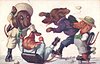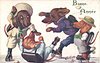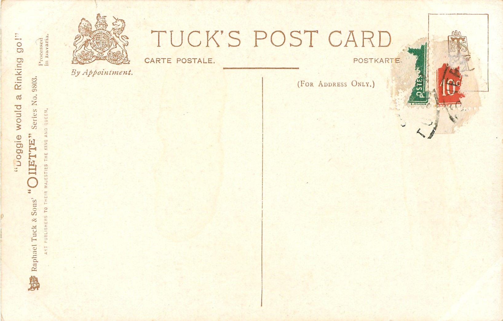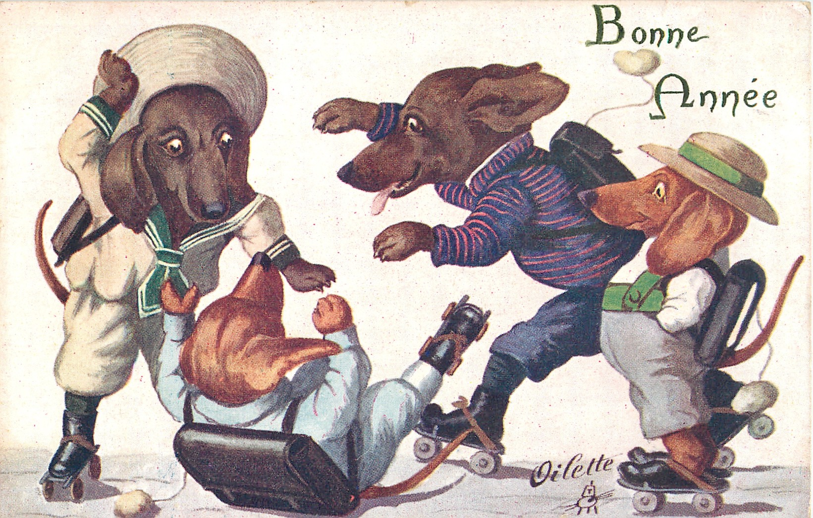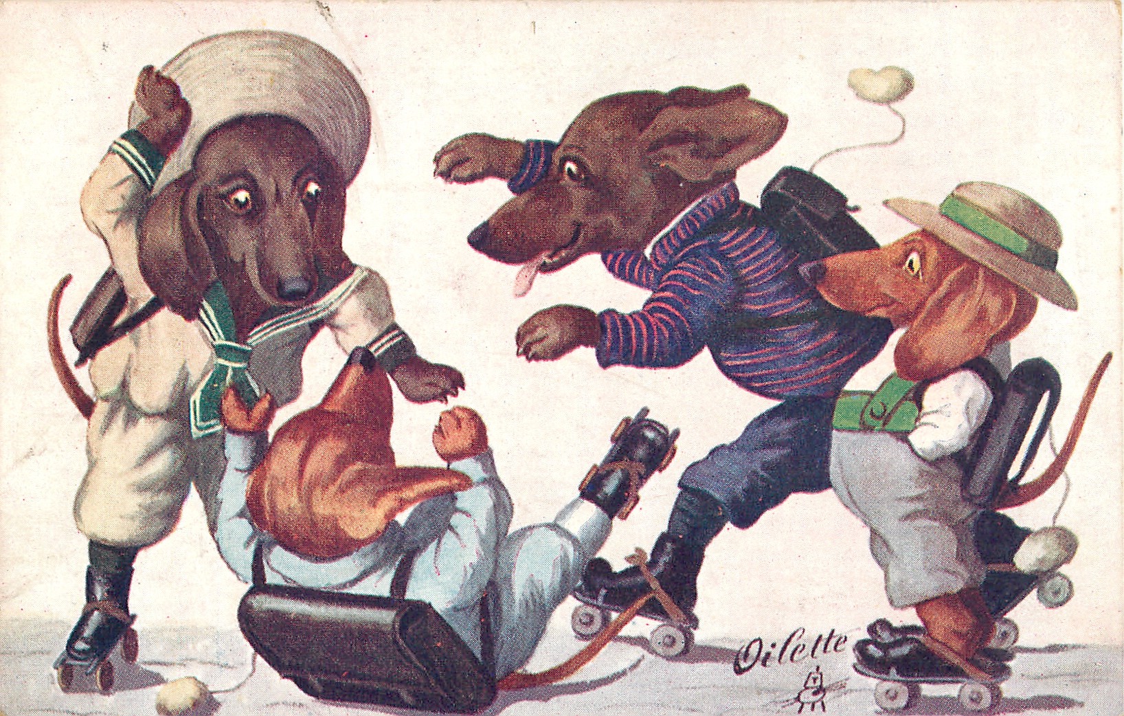 OILETTE, PROCESSED IN BAVARIA, listed as THE SKATING CARNIVAL in 1911/1912 & 1913/1914 Postcard Catalogues, same images German backs 9803 OILETTE & titled DACKEL AUF ROLLSCHUHEN