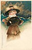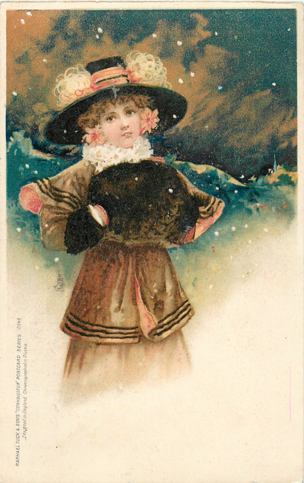 girl in brown outdoor outfit, wide brimmed hat. brown muff
