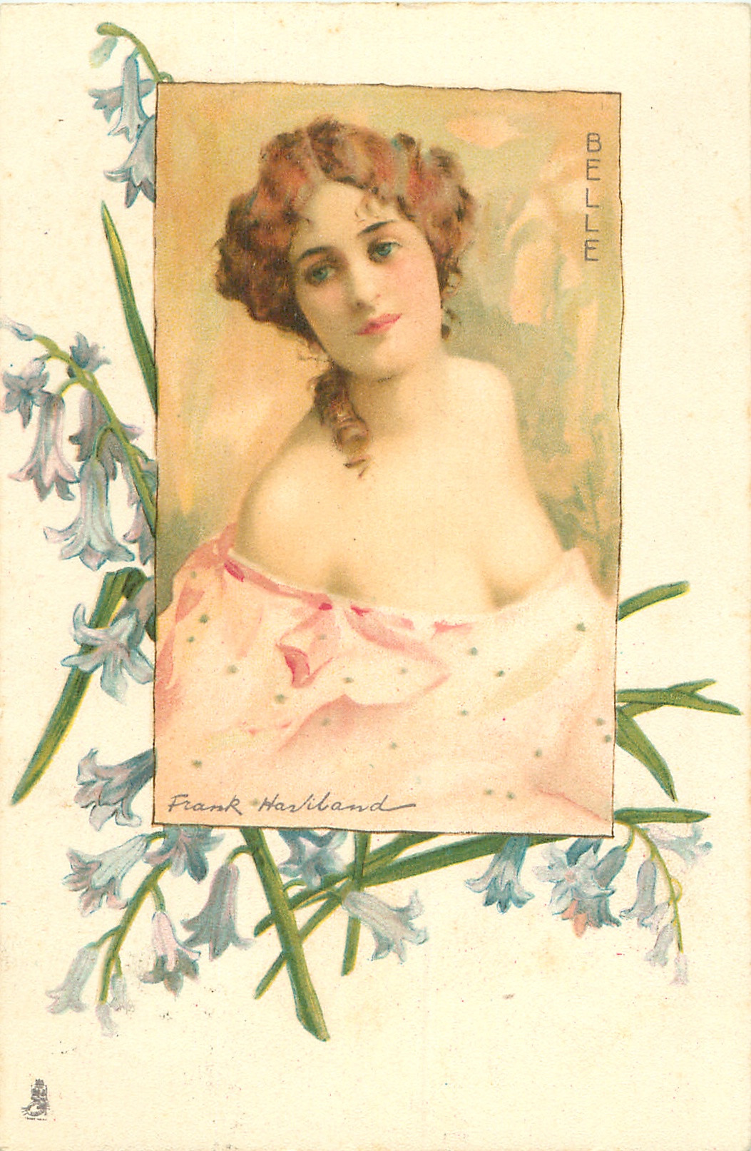 BELLE inset young lady with low cut pink dress, faces slightly right, looks up to left, bluebells