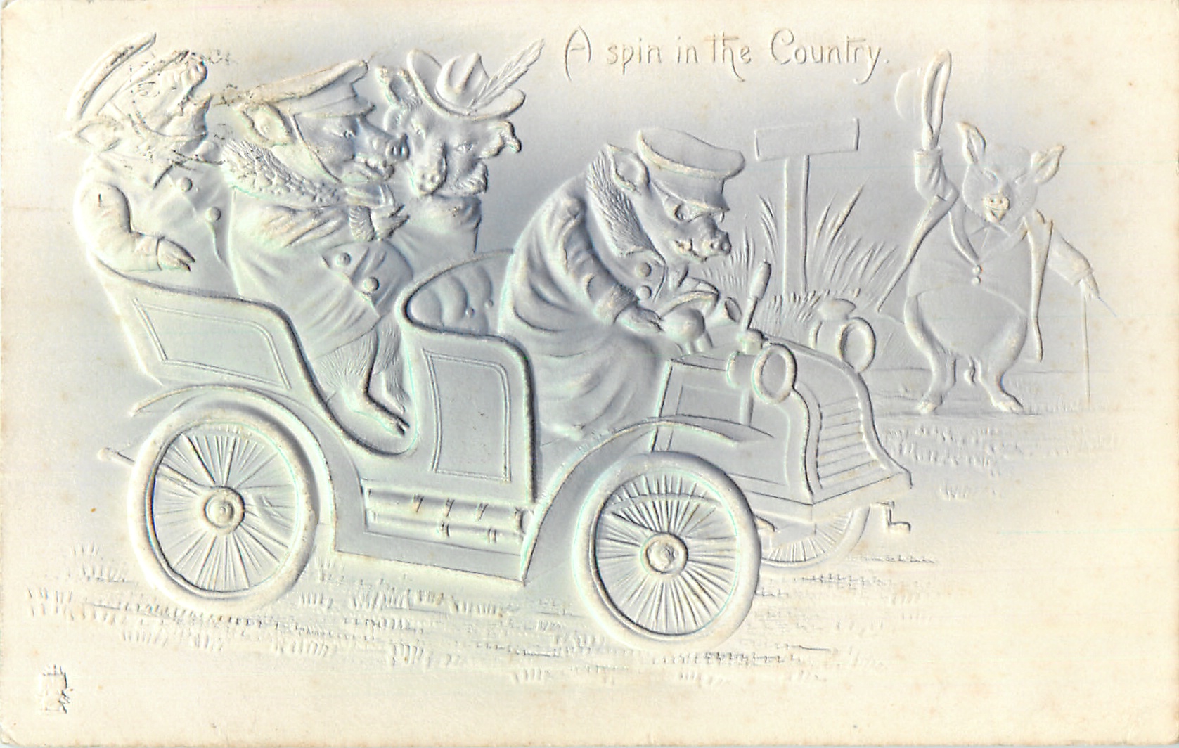 A SPIN IN THE COUNTRY pigs drive right, bystander waves, grey finish