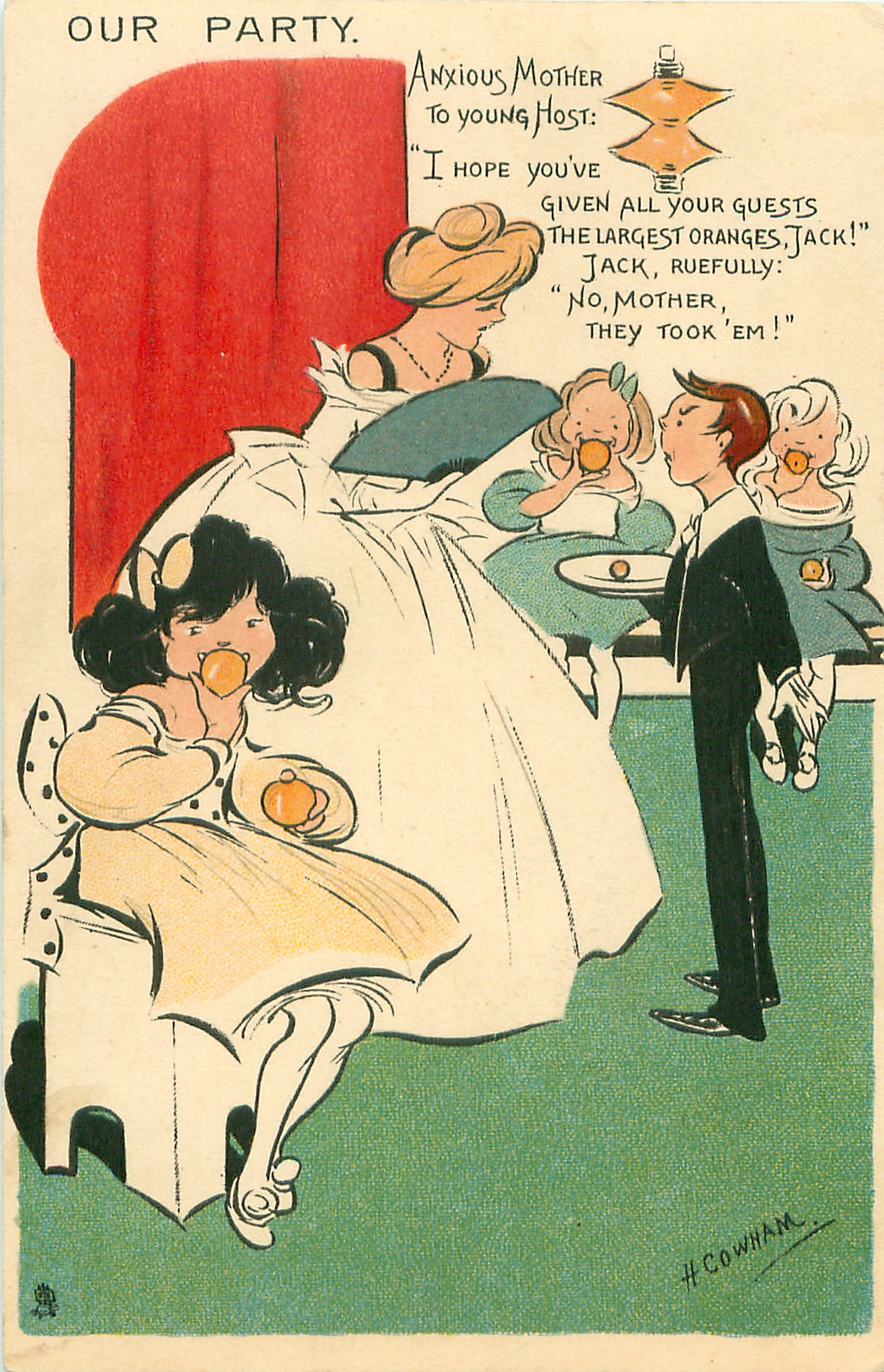 ANXIOUS MOTHER TO YOUNG HOST: "I HOPE YOU'VE GIVEN ALL YOUR GUESTS THE LARGEST ORANGES, JACK!" JACK, RUEFULLY: "NO, MOTHER, THEY TOOK 'EM!"