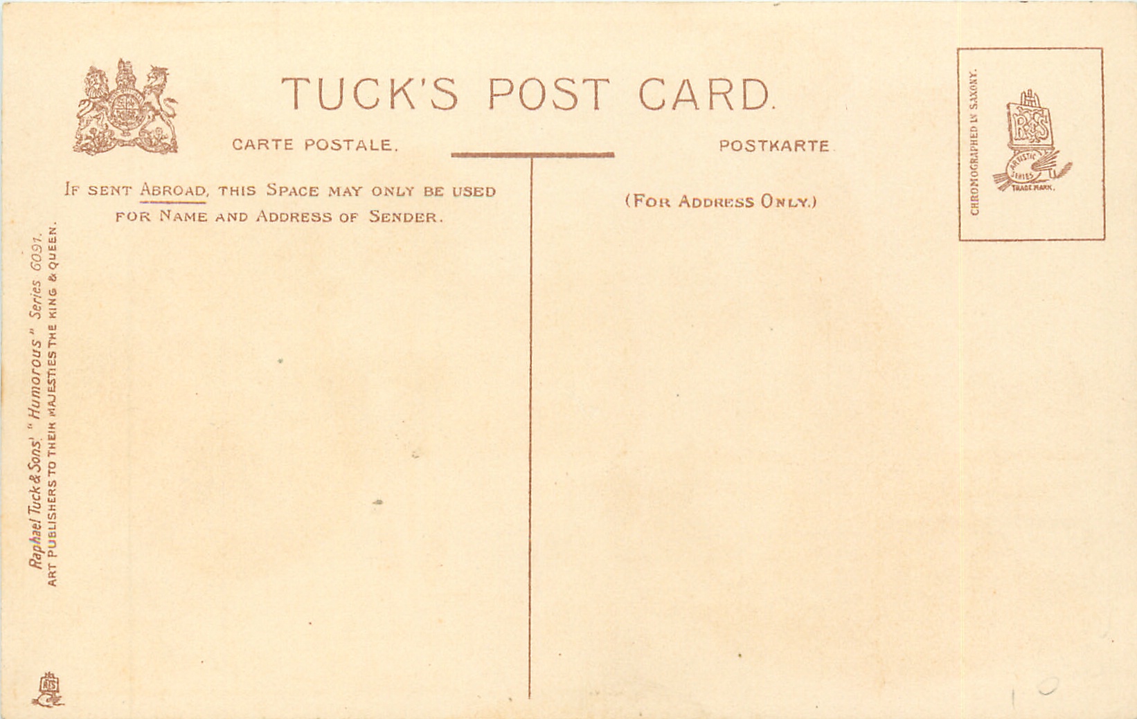 HUMOROUS, CHROMOGRAPHED IN SAXONY or CHROMO. SAXONY (in stamp box or not), set title does not appear on cards, 3 backs, listed as SONGS ILLUSTRATED in 1908/1909 & 1911/1912 Postcard Catalogue