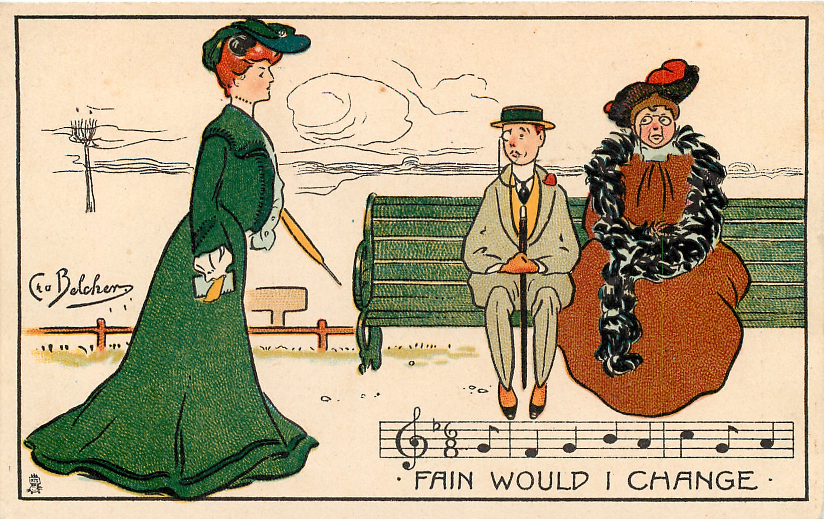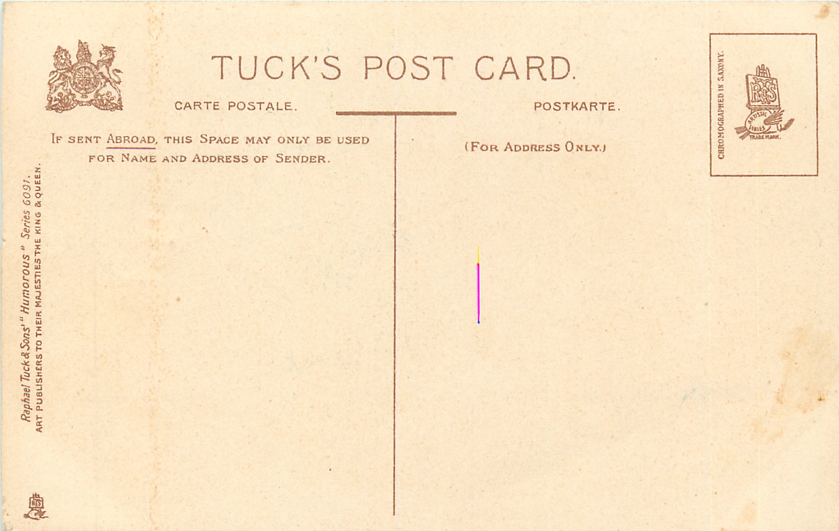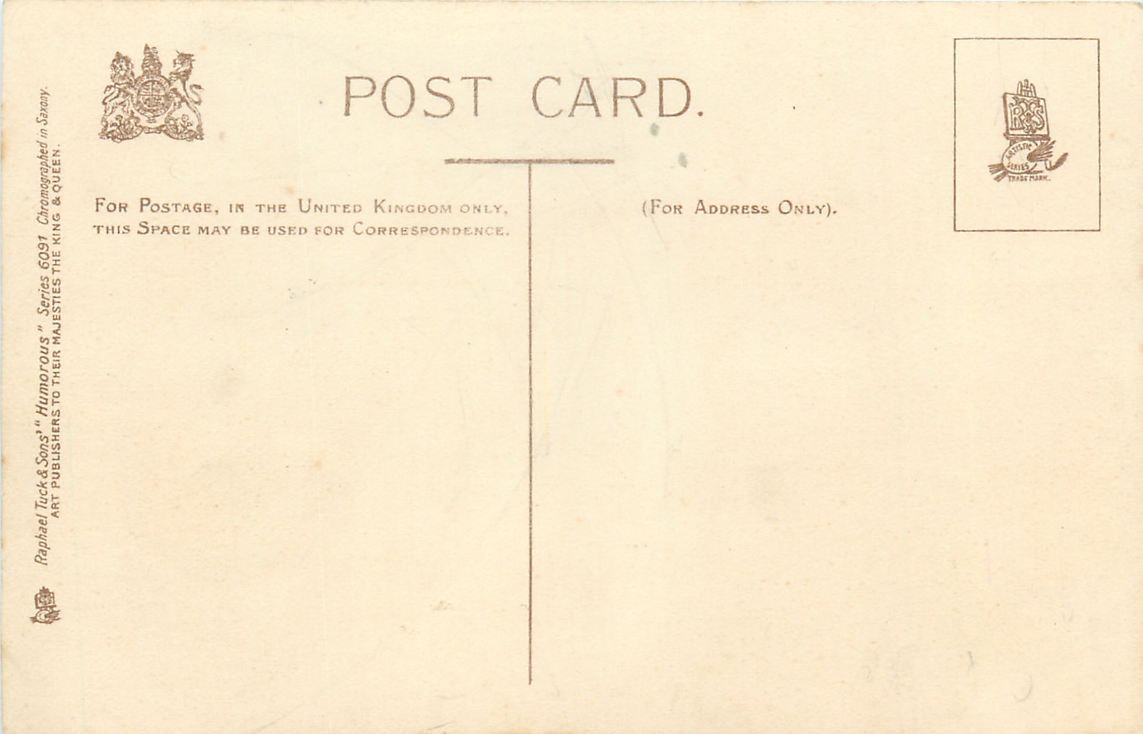 HUMOROUS, CHROMOGRAPHED IN SAXONY or CHROMO. SAXONY (in stamp box or not), set title does not appear on cards, 3 backs, listed as SONGS ILLUSTRATED in 1908/1909 & 1911/1912 Postcard Catalogue