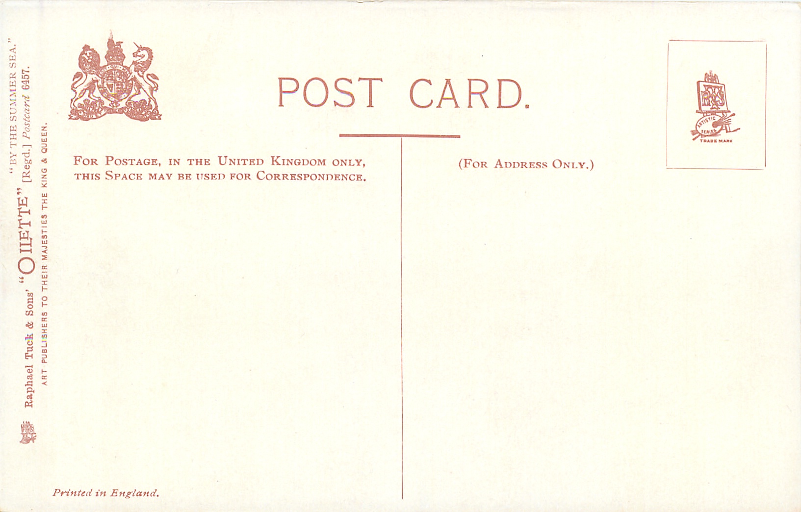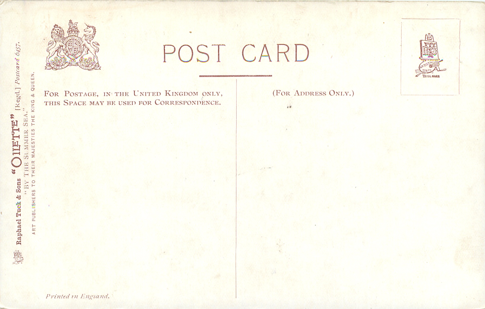 OILETTE, PRINTED IN ENGLAND, 3 backs, listed in 1908/1909 & 1911/1912 & 1913/1914 Postcard Catalogues