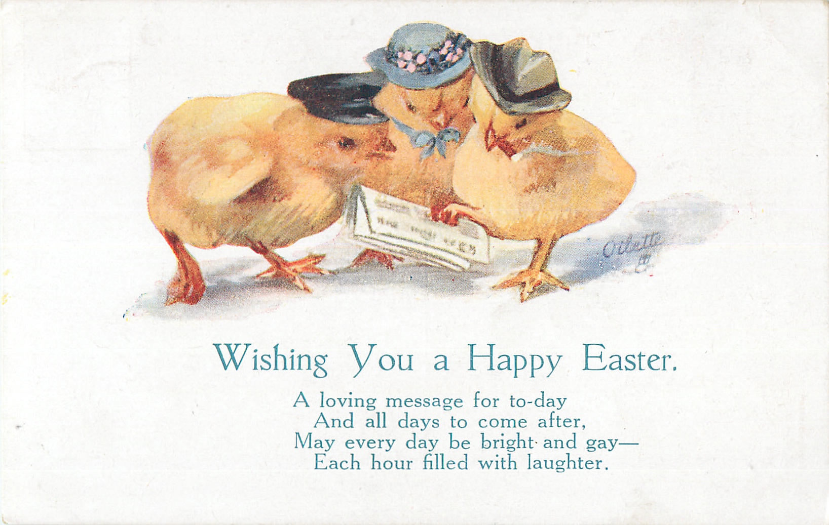 WISHING YOU A HAPPY EASTER three chicks in hats, newspaper