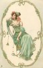 seated woman in oval, facing front looking left, gilt, green nouveau forget-me-not frame, grey surround