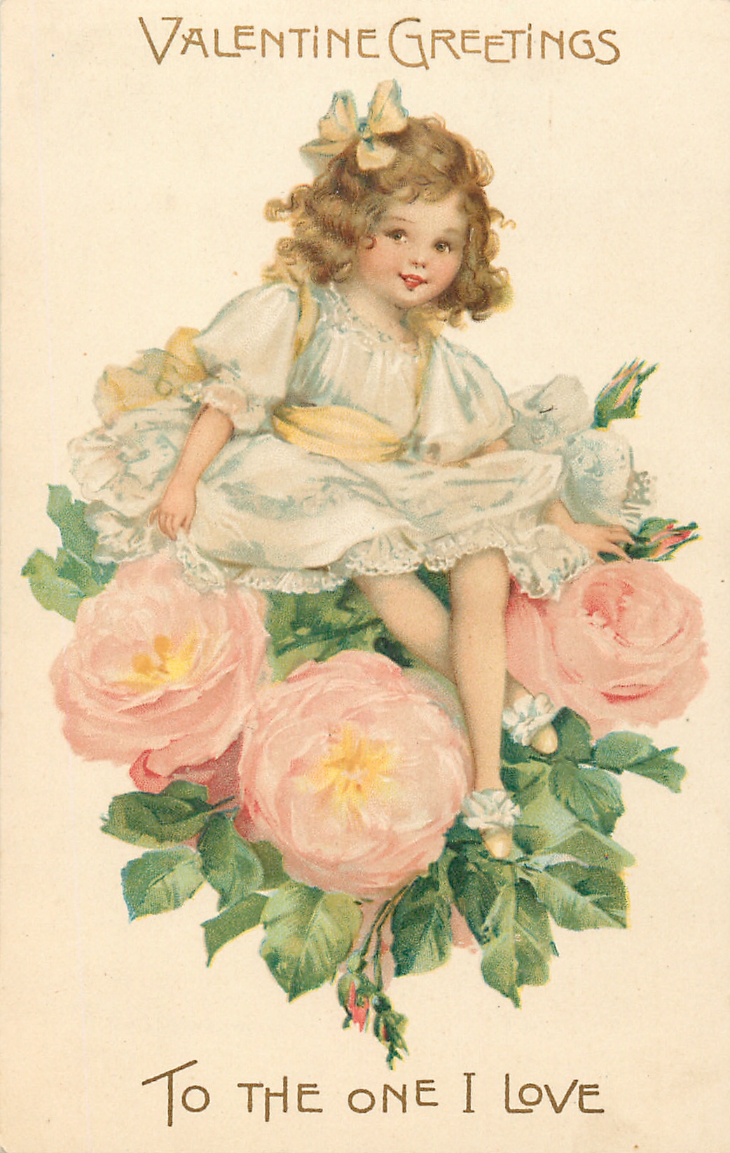 VALENTINE GREETINGS TO THE ONE I LOVE girl sits above three pink/cream roses
