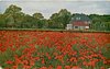 field of red poppies, trees behind, brick house distant right