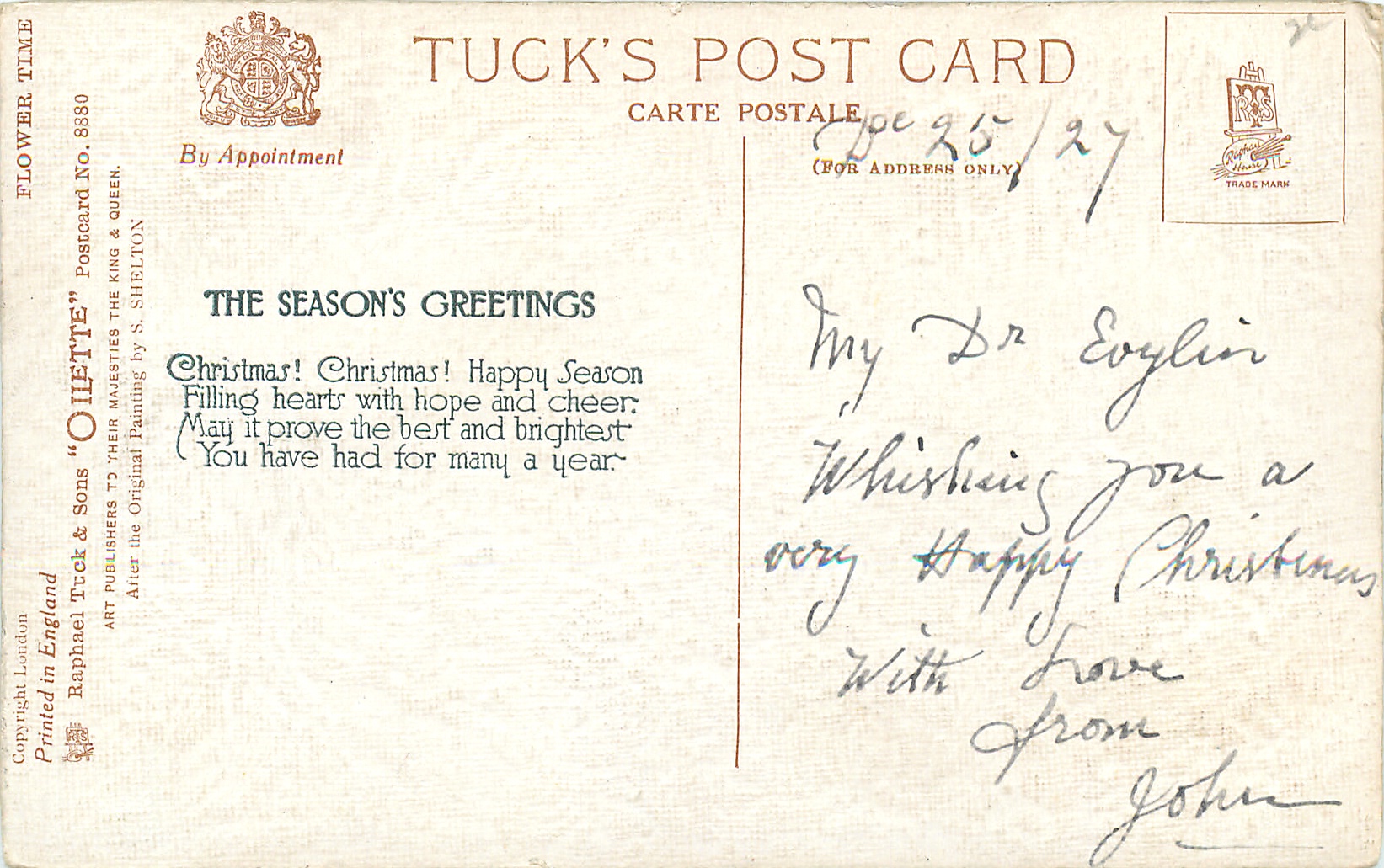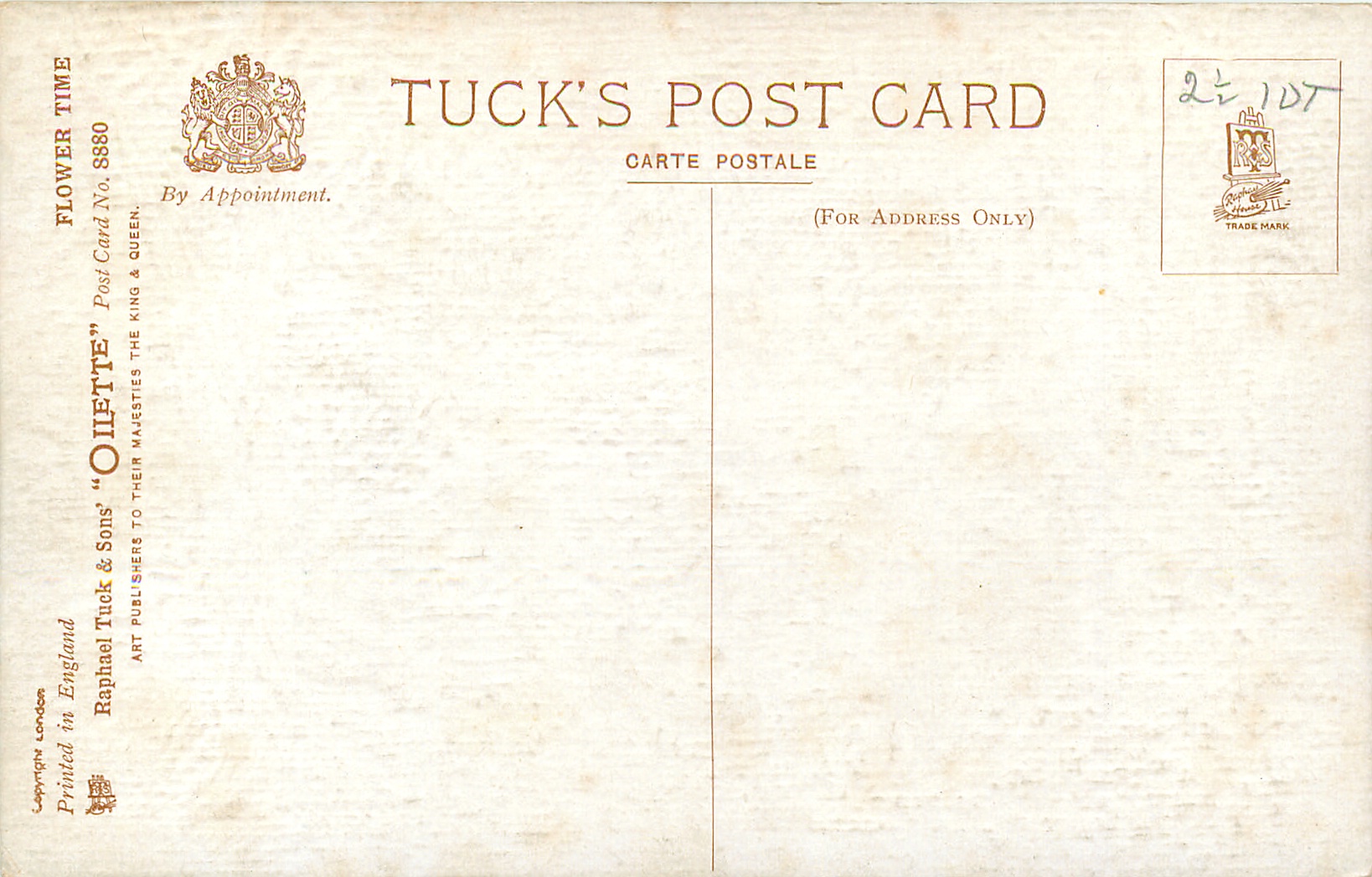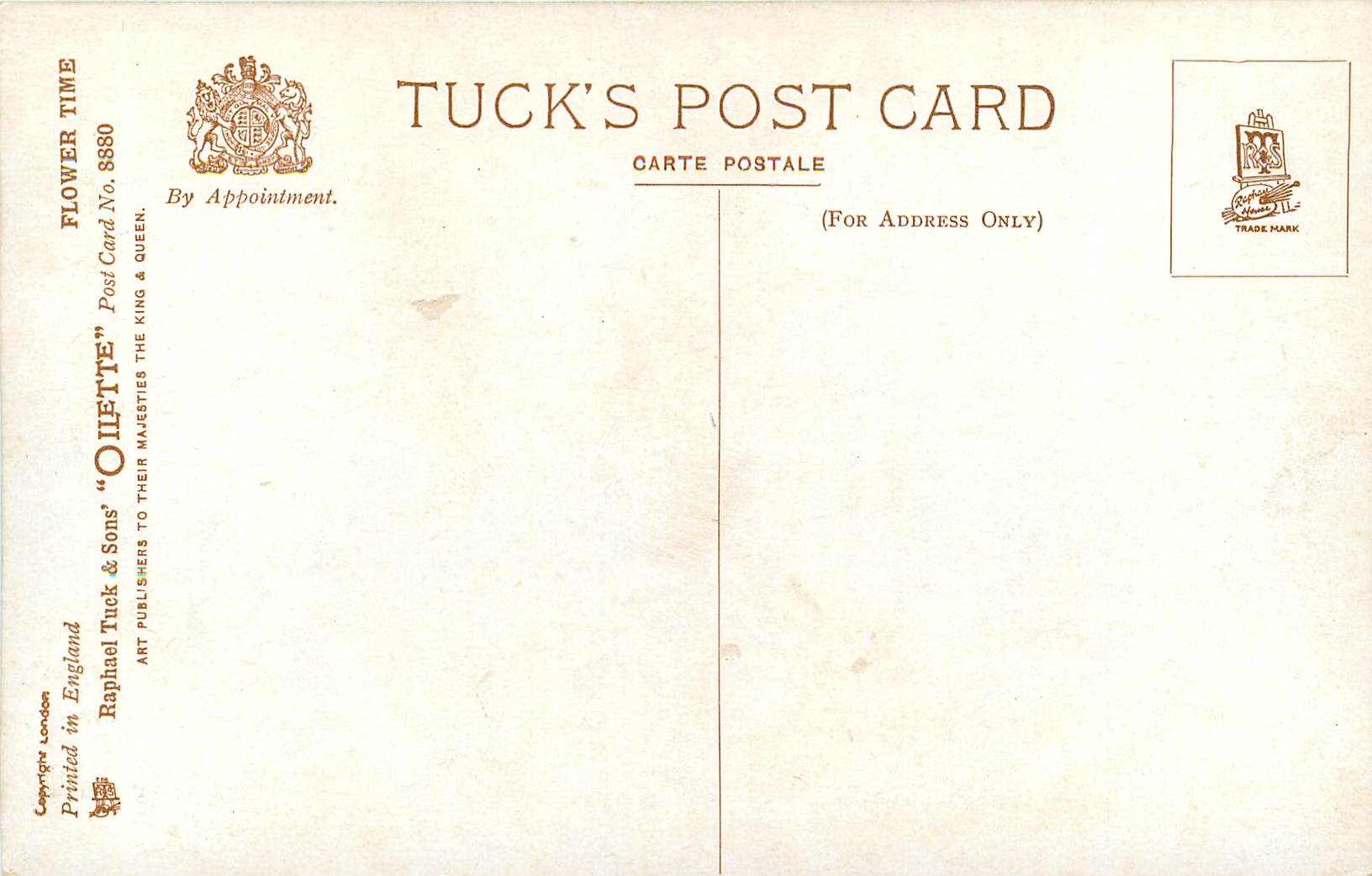 4 backs, same image 3602 WOODLAND WALKS, OILETTE or OILFACSIM (O.F. prefixes) or o/f (not so trade named), come with AMERICAN Y.M.C.A. ad on front, come with greetings & verse on back, listed in 1926/1927 POSTCARD catalogue