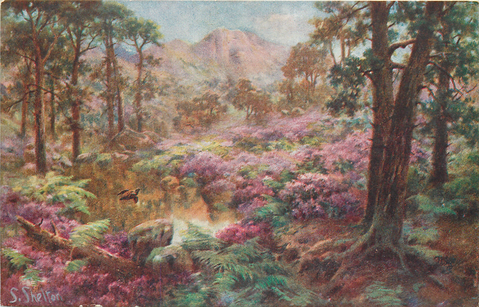 woodland scene, purple rhododendrons around pond, distant mountains, bird in flight over pond