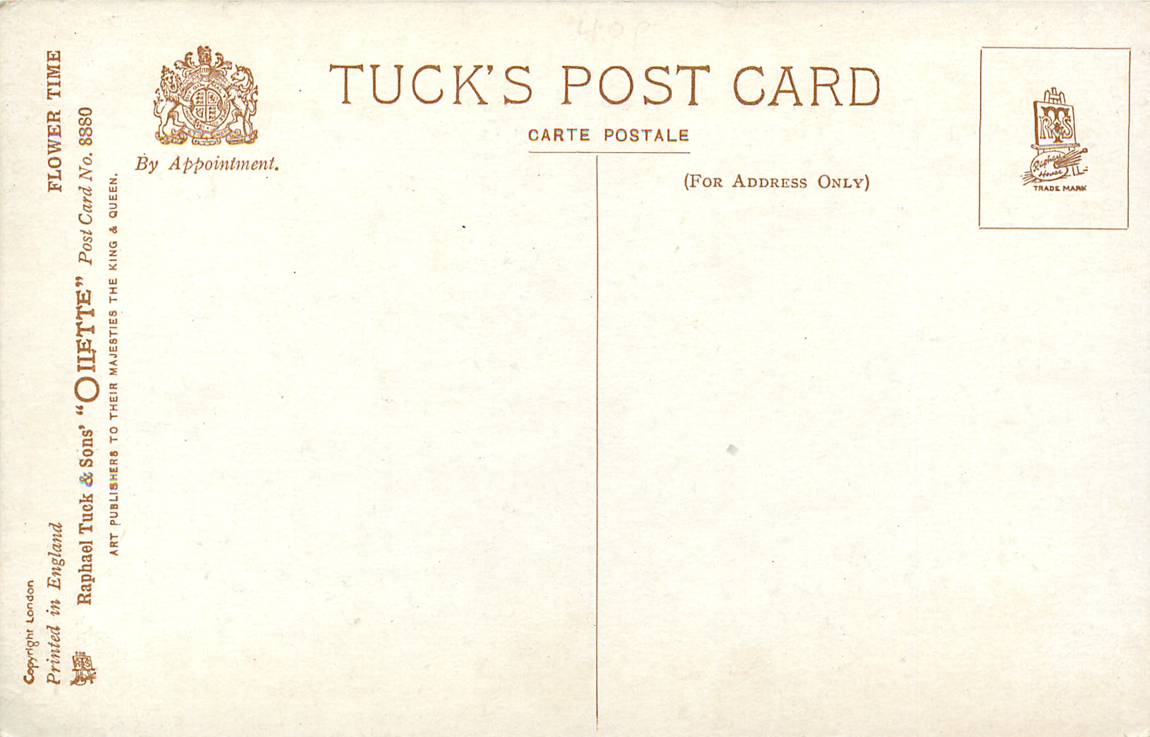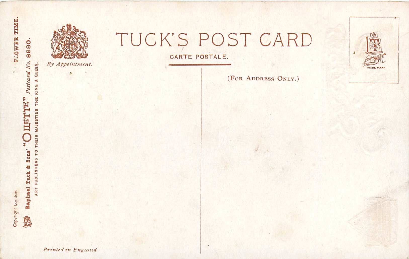 4 backs, same image 3602 WOODLAND WALKS, OILETTE or OILFACSIM (O.F. prefixes) or o/f (not so trade named), come with AMERICAN Y.M.C.A. ad on front, come with greetings & verse on back, listed in 1926/1927 POSTCARD catalogue