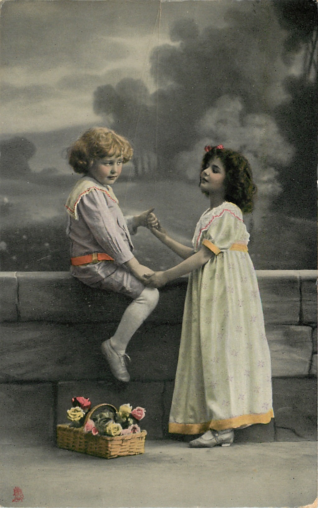 boy sits astride wall, girl stands in front of wall, they hold hands
