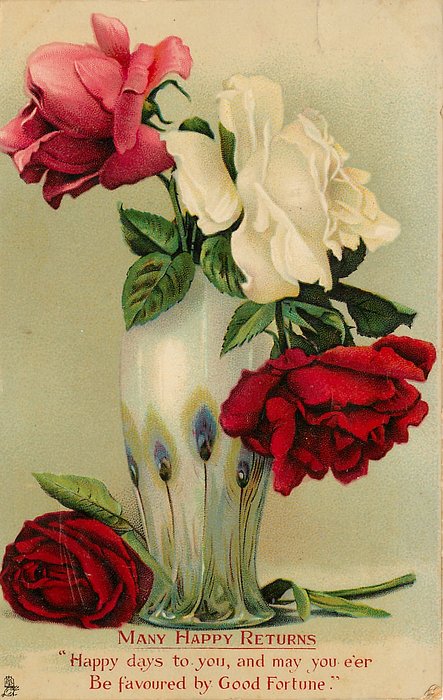 comes opt. in red MANY HAPPY RETURNS "HAPPY DAYS TO YOU, AND MAY YOU E'ER BE FAVOURED BY GOOD FORTUNE." same image N5168, new year inscriptions, in blue MANY HAPPY RETURNS verse
