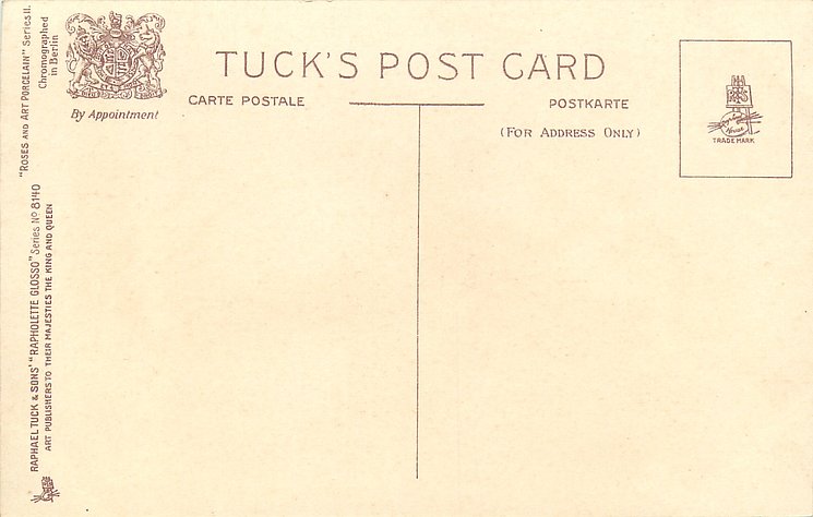 RAPHOLETTE GLOSSO, CHROMOGRAPHED IN BERLIN, same images 8140 without greetings, same shape vases but colour may differ, with other roses Birthday R 6084, 8139, same images with Xmas greetings C 5168