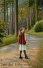 girl in blue striped dress, deep red cloak & hood walks away down road carrying small basket, looking back, distant view