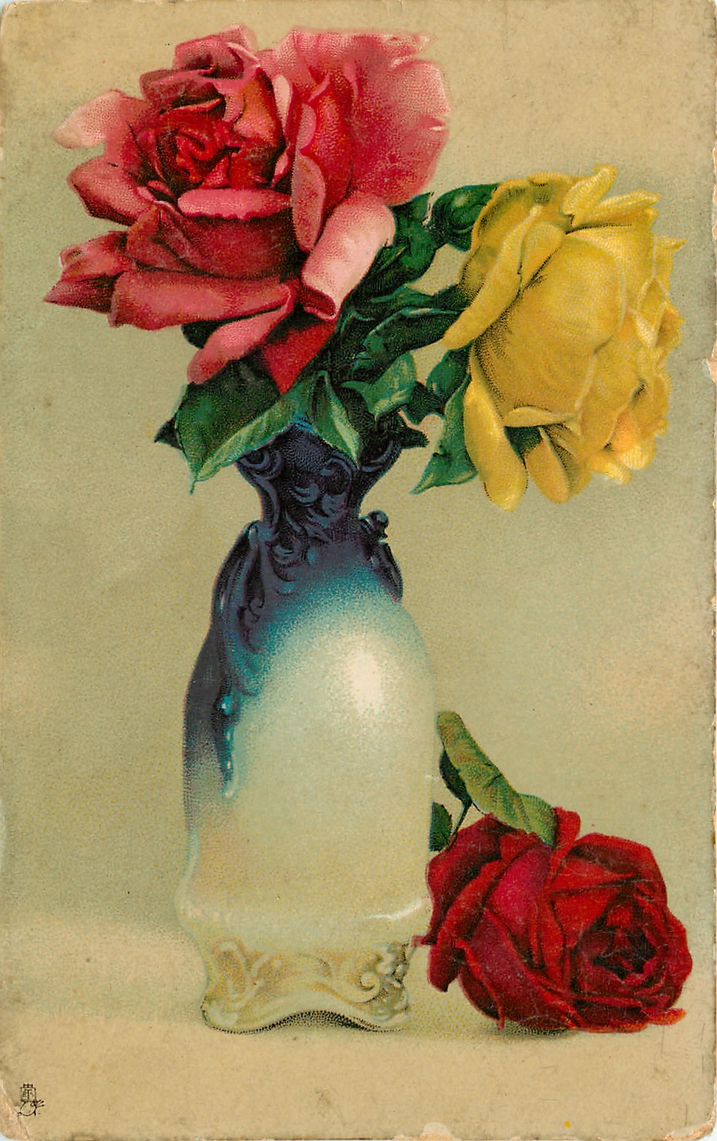 vase, blue at top, cream below with pink rose to left yellow to right, another red rose on table below