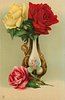 vase, floral design within gold, yellow rose to left, red to right, pink rose on table below