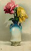 vase blue at top, cream below with two handles, pink rose to left, yellow right, no rose on table below