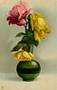 green vase, one pink rose left, two yellow roses right, one hangs down