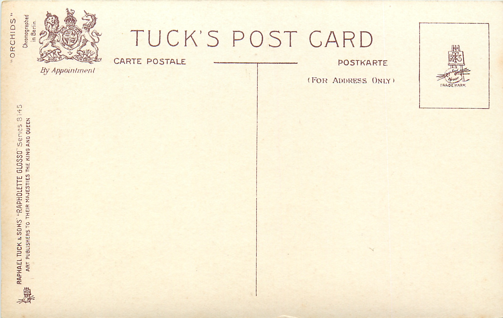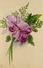 two purple orchids, one faces slightly to left, other slightly right, five stems to lower left