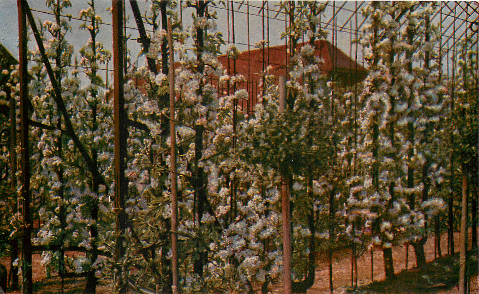 fruit trees in blossom, trained vertically on horizontal wires in front of path, roof of house behind