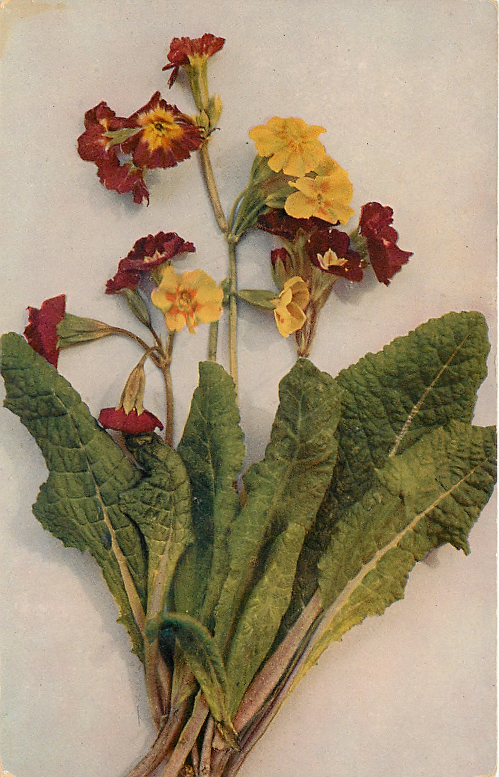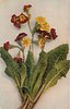 polyanthus,large upright leaves from bottom, yellow and crimson flowers above
