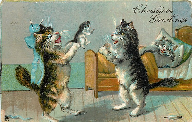 CHRISTMAS GREETINGS, two cats on hind legs bounce kitten between them, another cat in bed behind